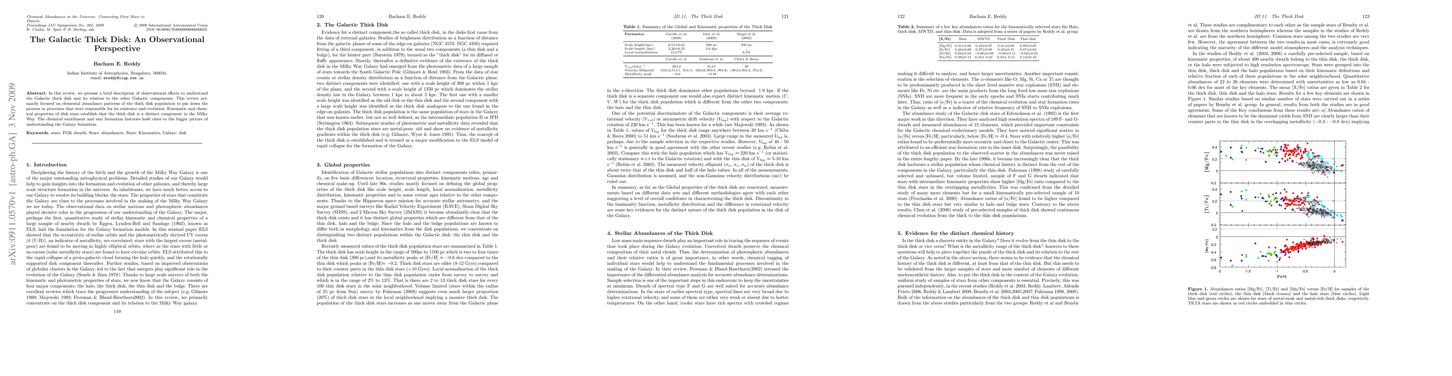 In this review, we present a brief description of observational efforts to understand the Galactic thick disk and its relation to the other Galactic components. This review primarily focused on elemental abundance patterns of the thick disk population to pin down the process or processes that were responsible for its existence and evolution. Kinematic and chemical properties of disk stars establish that the thick disk is a distinct component in the Milky Way. The chemical enrichment and star formation histories hold clues to the bigger picture of understanding the Galaxy formation.