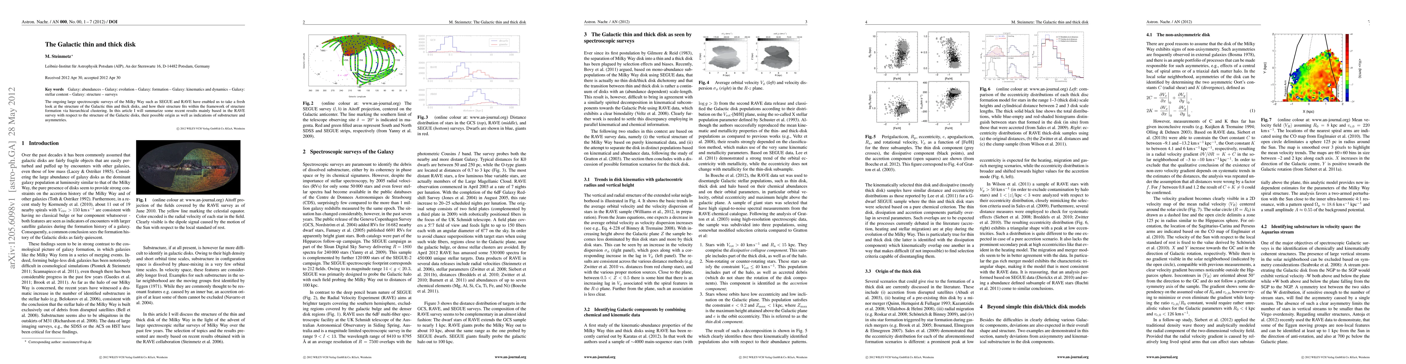 The ongoing large spectroscopic surveys of the Milky Way such as SEGUE and RAVE have enabled us to take a fresh look at the structure of the Galactic thin and thick disks, and how their structure fits within the framework of structure formation via hierarchical clustering. In this article I will summarize some recent results mainly based in the RAVE survey with respect to the structure of the Galactic disks, their possible origin as well as indications of substructure and asymmetries.