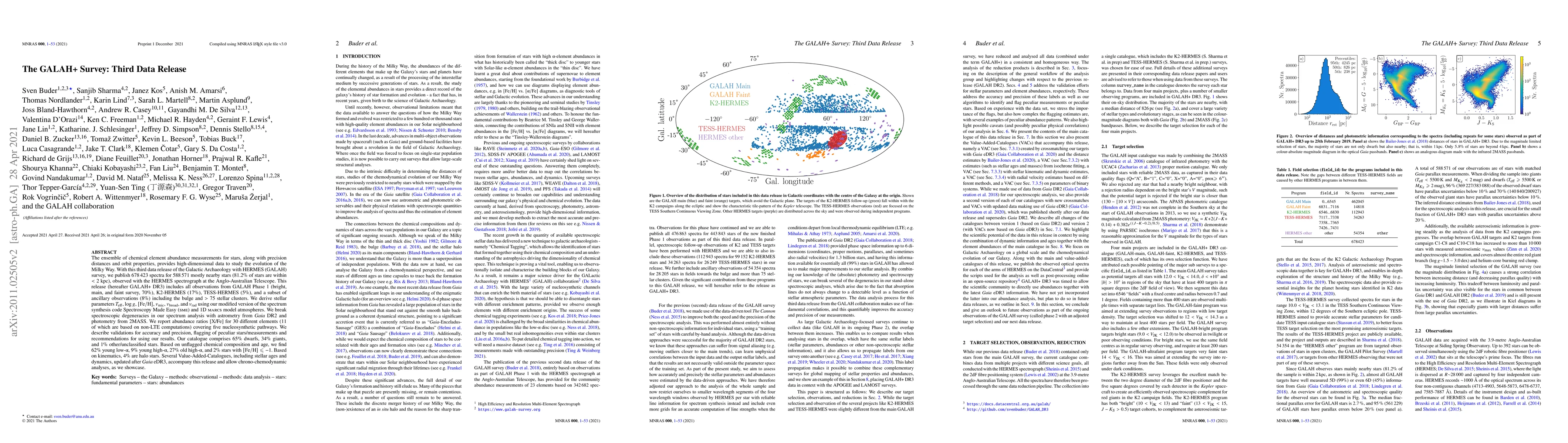 The GALAH+ Survey's third data release provides 678,423 spectra for 588,571 mostly nearby stars, offering detailed chemical abundances, stellar parameters, and kinematic properties to study Milky Way evolution. The release includes observations from multiple survey phases and incorporates data from Gaia and 2MASS to enhance accuracy.