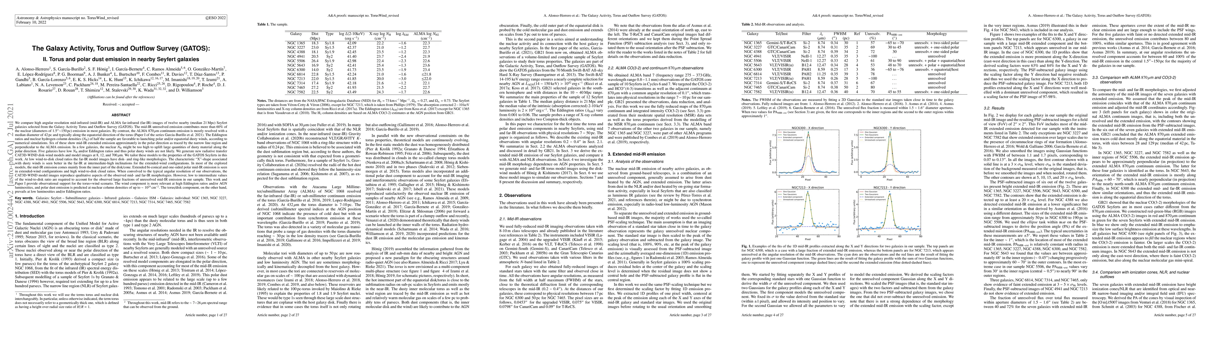 We compare mid-IR and ALMA far-IR images of 12 nearby Seyferts selected from GATOS. The mid-IR unresolved emission contributes more than 60% of the nuclear emission in most galaxies. By contrast, the ALMA 870micron continuum emission is mostly resolved and typically along the torus equatorial direction (Paper I, Garcia-Burillo et al. 2021). The Eddington ratios and nuclear hydrogen column densities NH of half the sample are favorable to launching polar and/or equatorial dusty winds, according to simulations. Six show mid-IR extended emission in the polar direction as traced by the NLR and perpendicular to the ALMA emission. In a few, the nuclear NH might be too high to uplift large quantities of dusty material along the polar direction. Five galaxies have low NH and/or Eddington ratios and thus polar dusty winds are not likely. We generate new CAT3D-WIND disk-wind model images. At low wind-to-disk cloud ratios the far-IR model images have disk- and ring-like morphologies. The X-shape associated with dusty winds is seen better in the far-IR at intermediate-high inclinations for the extended-wind configurations. In most models, the mid-IR emission comes from the inner part of the disk/cone. Extended bi-conical and one-sided polar mid-IR emission is seen in extended-wind configurations and high wind-to-disk cloud ratios. When convolved to our resolution, the model images reproduce qualitative aspects of the observed morphologies. Low-intermediate wind-to-disk ratios are required to account for the large fractions of unresolved mid-IR emission. This work and Paper I provide observational support for the torus+wind scenario. The wind component is more relevant at high Eddington ratios and/or AGN luminosities, and polar dust emission is predicted at NH of up to $10^{24}$cm$^{-2}$. The torus/disk component, on the other hand, prevails at low luminosities and/or Eddington ratios. (Abridged)