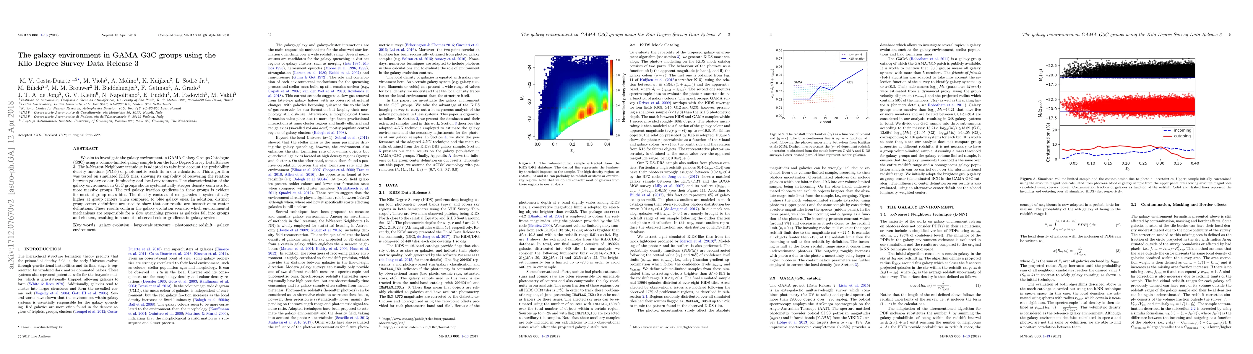 This study uses the Kilo Degree Survey Data Release 3 to analyze the galaxy environment in GAMA Galaxy Groups Catalogue, finding steeper density contrasts in more massive groups and higher red galaxy density at group centers. The results support the idea that environmental mechanisms gradually quench galaxies, leading to smooth color gradients.
