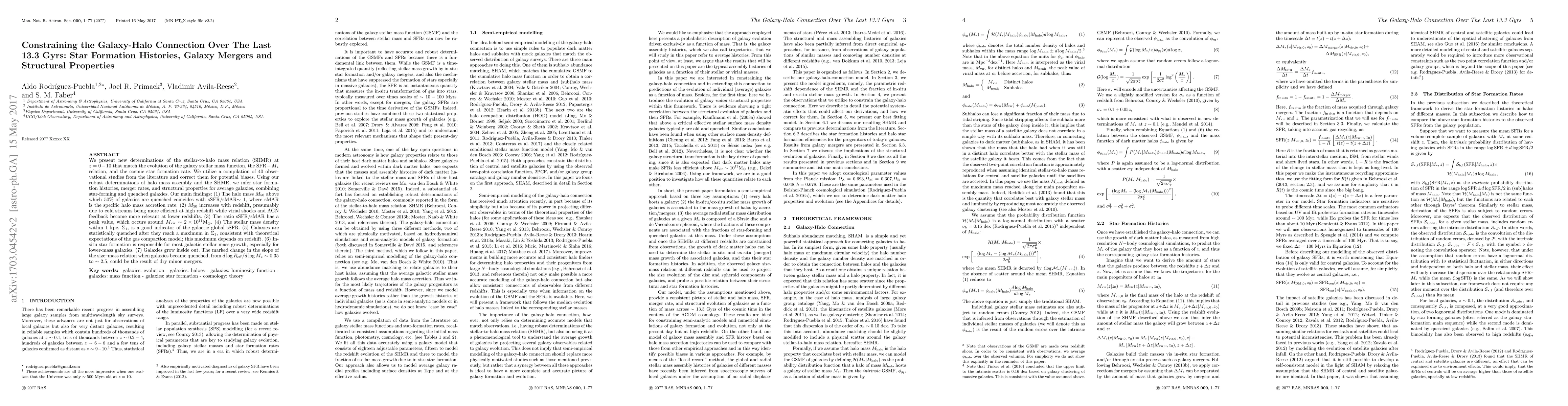 We present new determinations of the stellar-to-halo mass relation (SHMR) at $z=0-10$ that match the evolution of the galaxy stellar mass function, the SFR$-M_*$ relation,and the cosmic star formation rate. We utilize a compilation of 40 observational studies from the literature and correct them for potential biases. Using our robust determinations of halo mass assembly and the SHMR, we infer star formation histories, merger rates, and structural properties for average galaxies, combining star-forming and quenched galaxies. Our main findings: (1) The halo mass $M_{50}$ above which 50\% of galaxies are quenched coincides with sSFR/sMAR$\sim1$, where sMAR is the specific halo mass accretion rate. (2) $M_{50}$ increases with redshift, presumably due to cold streams being more efficient at high redshift while virial shocks and AGN feedback become more relevant at lower redshifts. (3) The ratio sSFR/sMAR has a peak value, which occurs around $M_{\rm vir}\sim2\times10^{11}M_{\odot}$. (4) The stellar mass density within 1 kpc, $\Sigma_1$, is a good indicator of the galactic global sSFR. (5) Galaxies are statistically quenched after they reach a maximum in $\Sigma_1$, consistent with theoretical expectations of the gas compaction model; this maximum depends on redshift. (6) In-situ star formation is responsible for most galactic stellar mass growth, especially for lower-mass galaxies. (7) Galaxies grow inside out. The marked change in the slope of the size--mass relation when galaxies became quenched, from $d\log R_{\rm eff}/d\log M_*\sim0.35$ to $\sim2.5$, could be the result of dry minor mergers.
