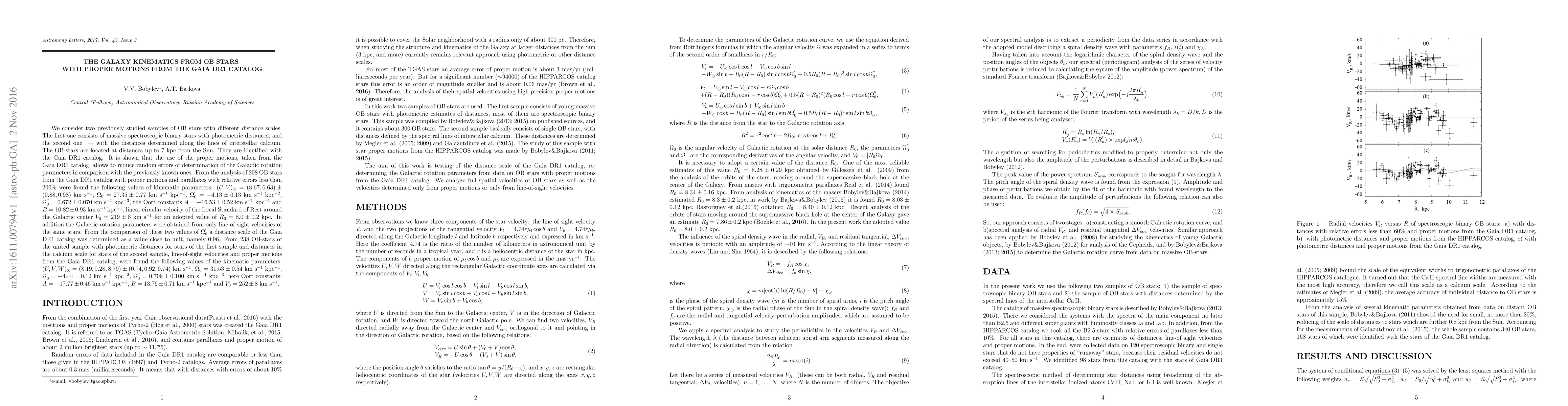 This paper analyzes OB stars from the Gaia DR1 catalog to determine Galactic kinematic parameters, showing improved accuracy using proper motions. The study finds the solar motion parameters (U, V, W)_\odot and rotation parameters, concluding that the Gaia DR1 distance scale is approximately 0.96.