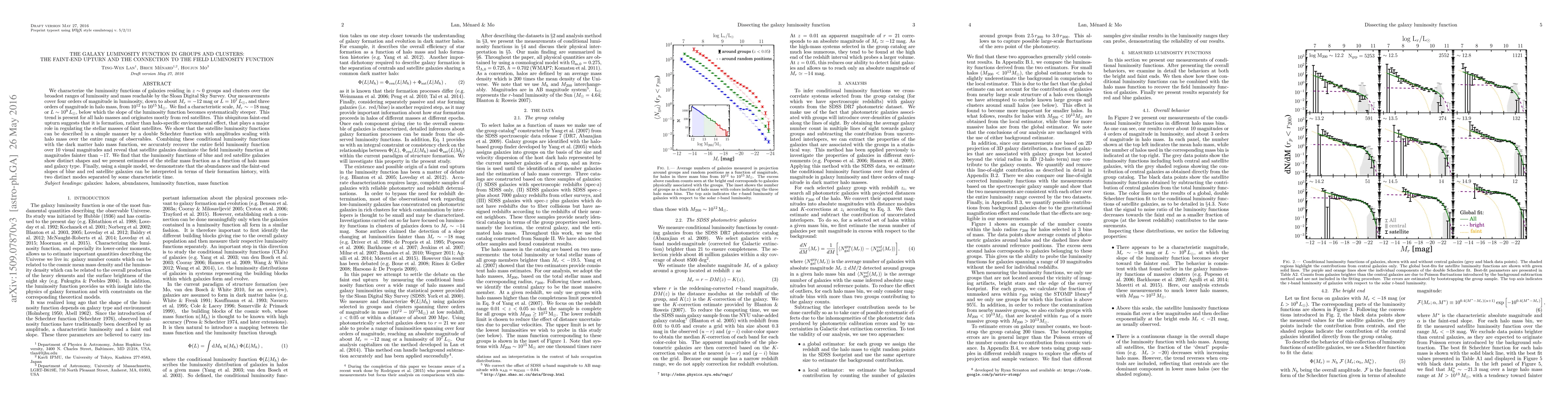 This paper investigates the galaxy luminosity function in groups and clusters, finding a faint-end upturn below $M_r\sim-18$ mag, primarily due to red satellites. The study reveals that satellite galaxies dominate the field luminosity function at magnitudes fainter than $-17$, and the luminosity functions of blue and red satellites exhibit distinct shapes.