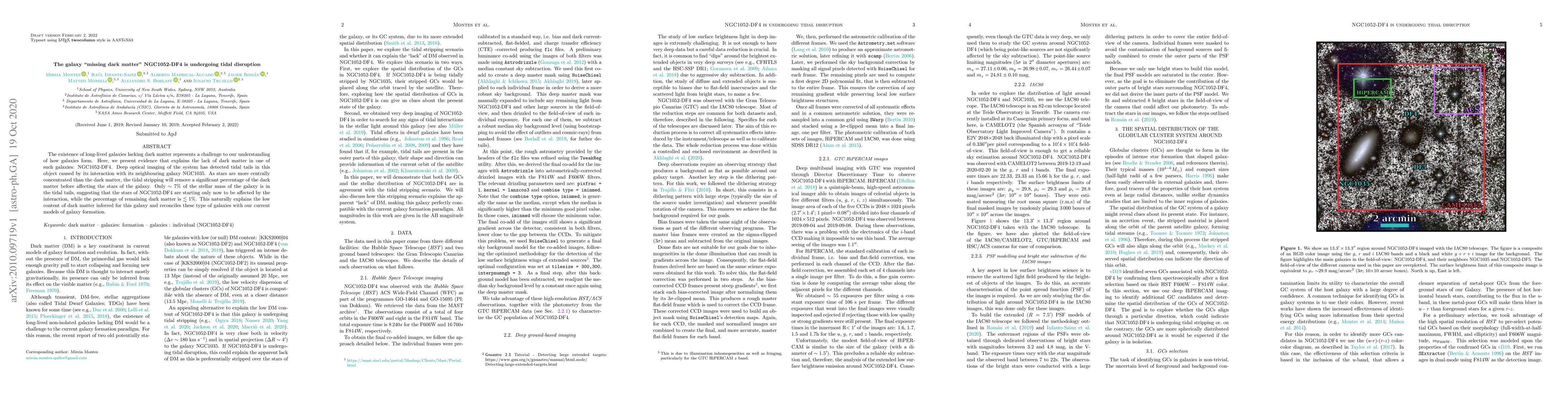 The galaxy NGC1052-DF4, previously thought to lack dark matter, is now found to be undergoing tidal disruption by its neighboring galaxy NGC1035, which explains its low dark matter content as the disruption preferentially removes dark matter before affecting the stars. This interaction reconciles such galaxies with current galaxy formation models.