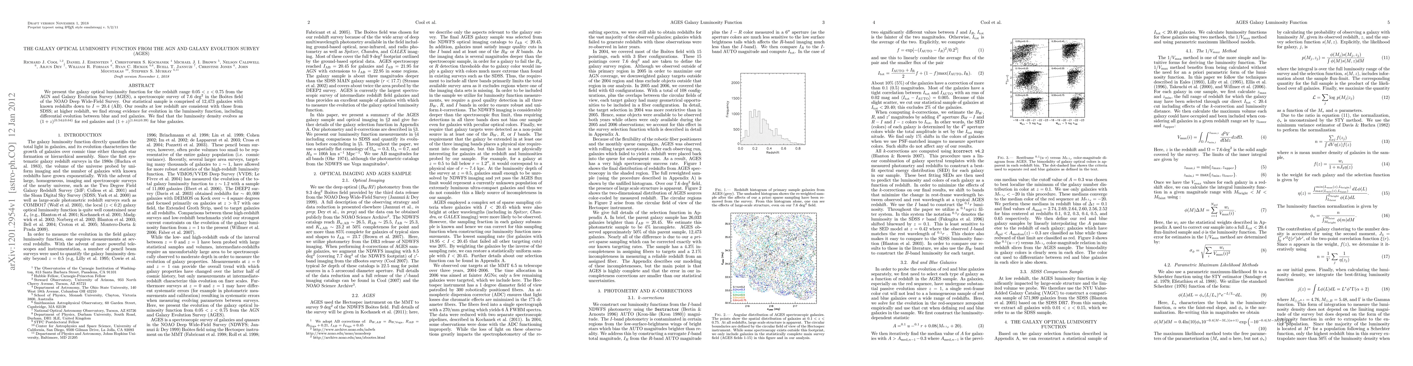 The research utilized spectroscopic data from the AGN and Galaxy Evolution Survey (AGES) covering 7.6 sq. deg. in the Bootes field of the NOAO Deep Wide-Field Survey to determine the galaxy optical luminosity function for 0.05<z<0.75.