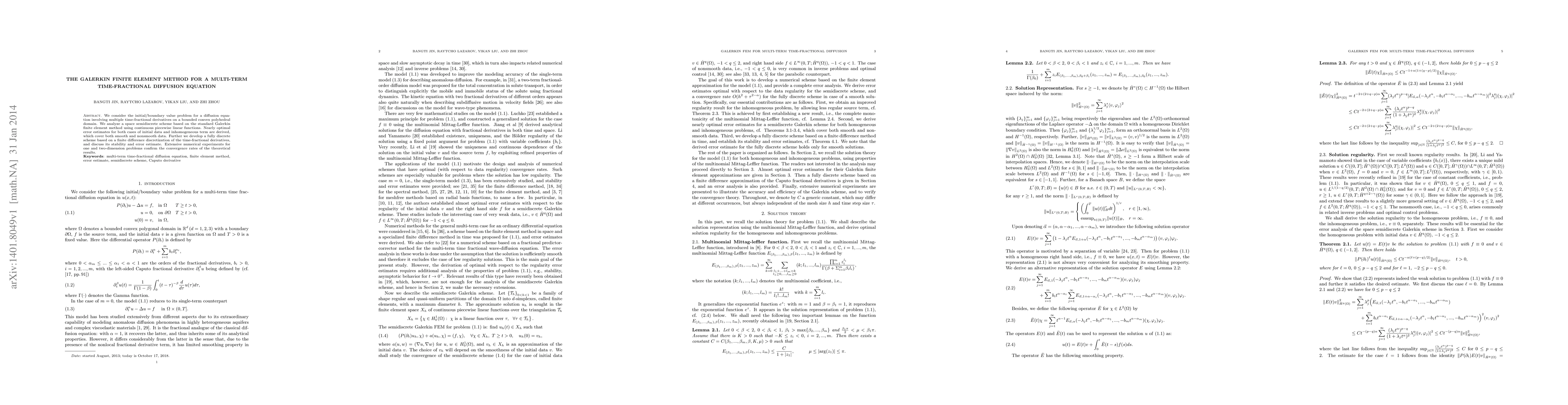 This paper develops a Galerkin finite element method for solving a multi-term time-fractional diffusion equation. It provides nearly optimal error estimates for both initial and inhomogeneous terms, and confirms theoretical results through numerical experiments.