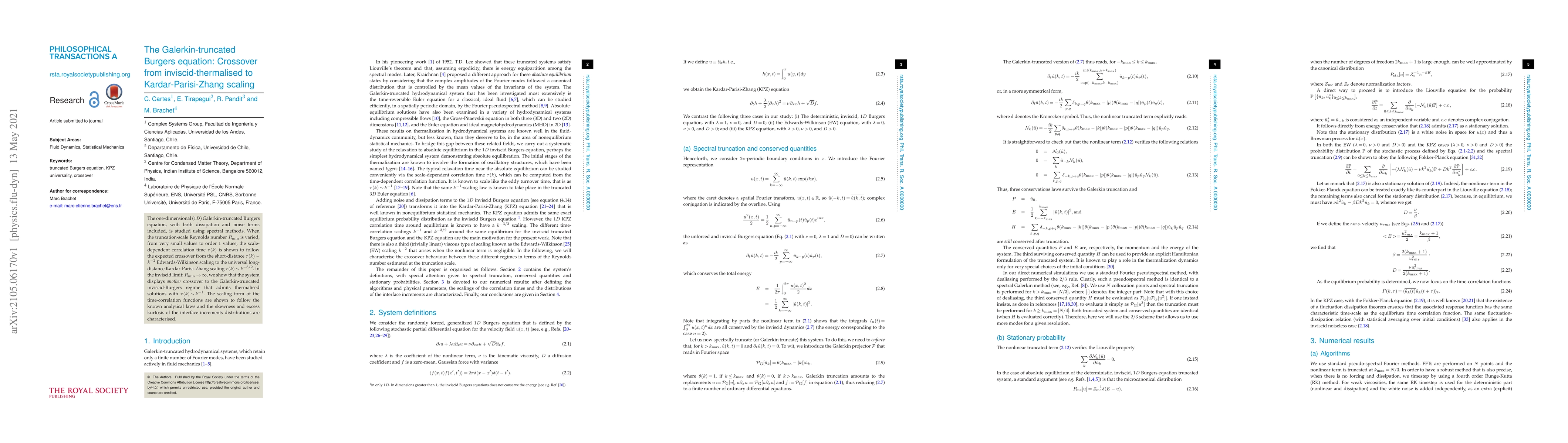 This paper investigates the one-dimensional Galerkin-truncated Burgers equation, demonstrating a crossover in scale-dependent correlation time from Edwards-Wilkinson to Kardar-Parisi-Zhang scaling as the truncation-scale Reynolds number varies. It also shows an additional crossover to an inviscid-thermalised regime with $\tau(k) \sim k^{-1}$ in the inviscid limit.