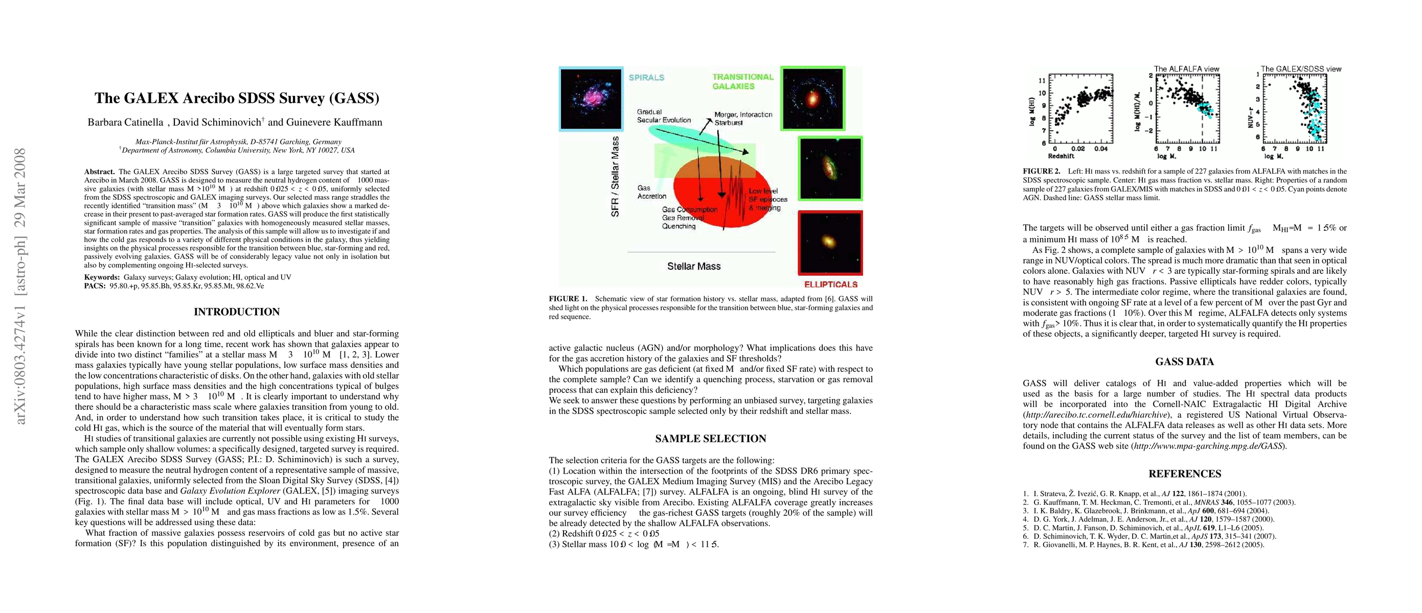 The GALEX Arecibo SDSS Survey (GASS) analyzes 1000 massive galaxies to understand the transition from blue star-forming to red passively evolving galaxies. The study aims to investigate how gas responds to different physical conditions in these galaxies.