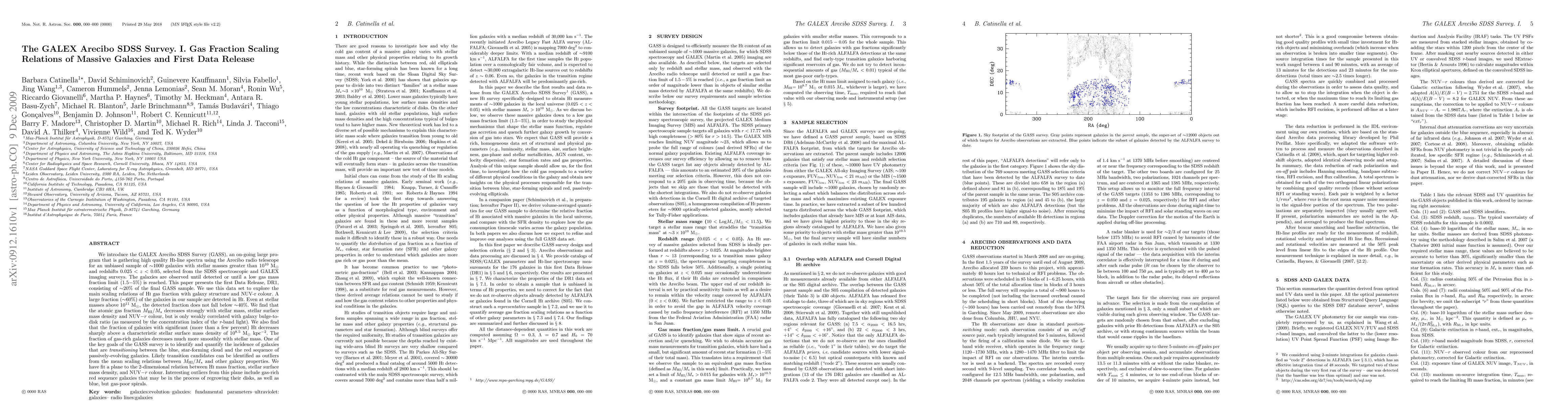 The GALEX Arecibo SDSS Survey (GASS) presents its first data release, focusing on HI gas fraction scaling relations for massive galaxies. The study reveals that gas fraction decreases with stellar mass and NUV-r colour, while being weakly correlated with galaxy structure, aiming to identify galaxies transitioning from star-forming to passive states.