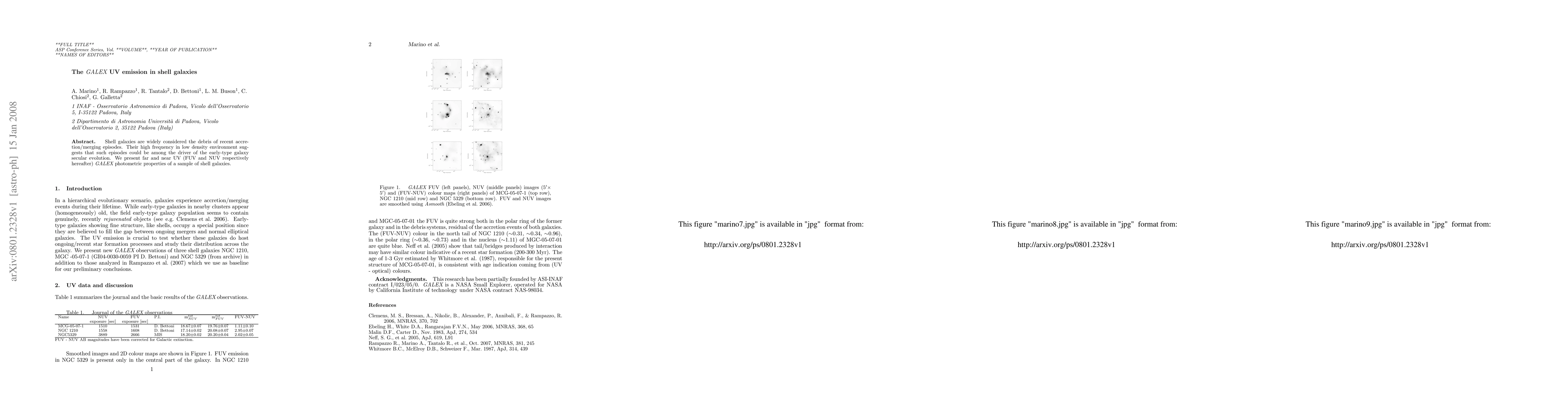 Shell galaxies are widely considered the debris of recent accretion/merging episodes. Their high frequency in low density environment suggests that such episodes could be among the driver of the early-type galaxy secular evolution. We present far and near UV (FUV and NUV respectively hereafter) GALEX photometric properties of a sample of shell galaxies.