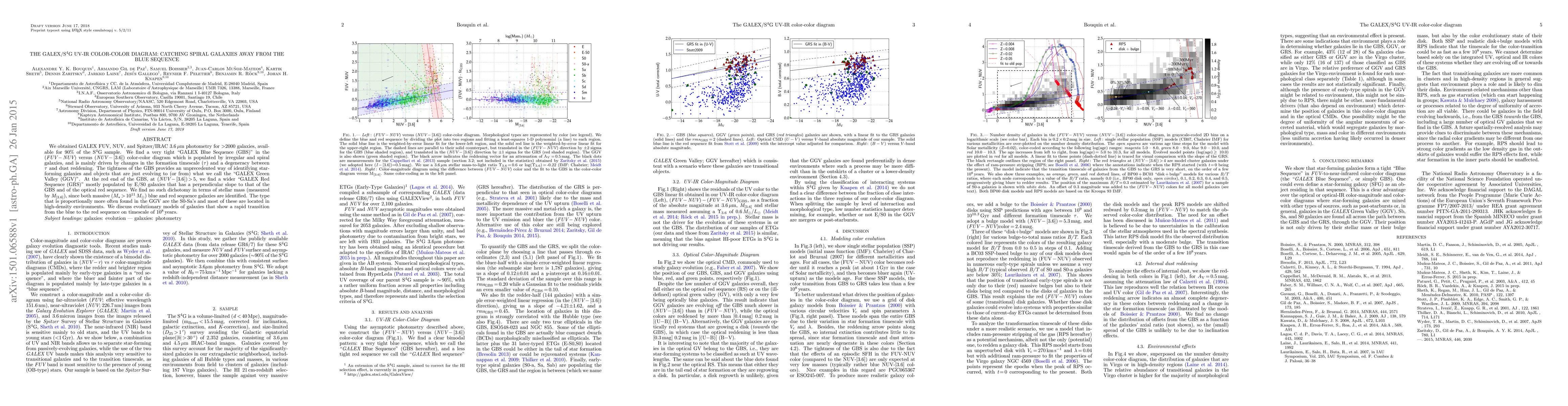 This study utilizes GALEX and Spitzer/IRAC data to identify a "GALEX Blue Sequence" in the UV-IR color-color diagram, primarily populated by star-forming spiral and irregular galaxies. The study also identifies a "GALEX Red Sequence" at the diagram's red end, mostly comprising elliptical and lenticular galaxies, indicating a rapid evolutionary transition from blue to red on timescales of 10^8 years.