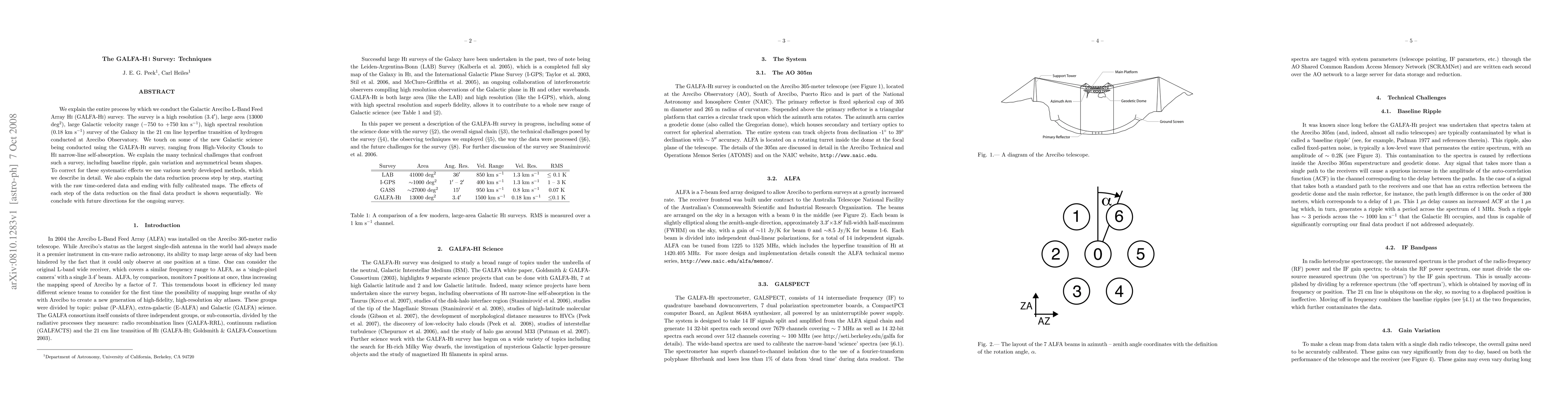 The GALFA-HI Survey details the high-resolution, large-area 21 cm line survey of the Galaxy, addressing technical challenges like baseline ripple and gain variation through newly developed correction methods. The paper also outlines the comprehensive data reduction process from raw data to calibrated maps.