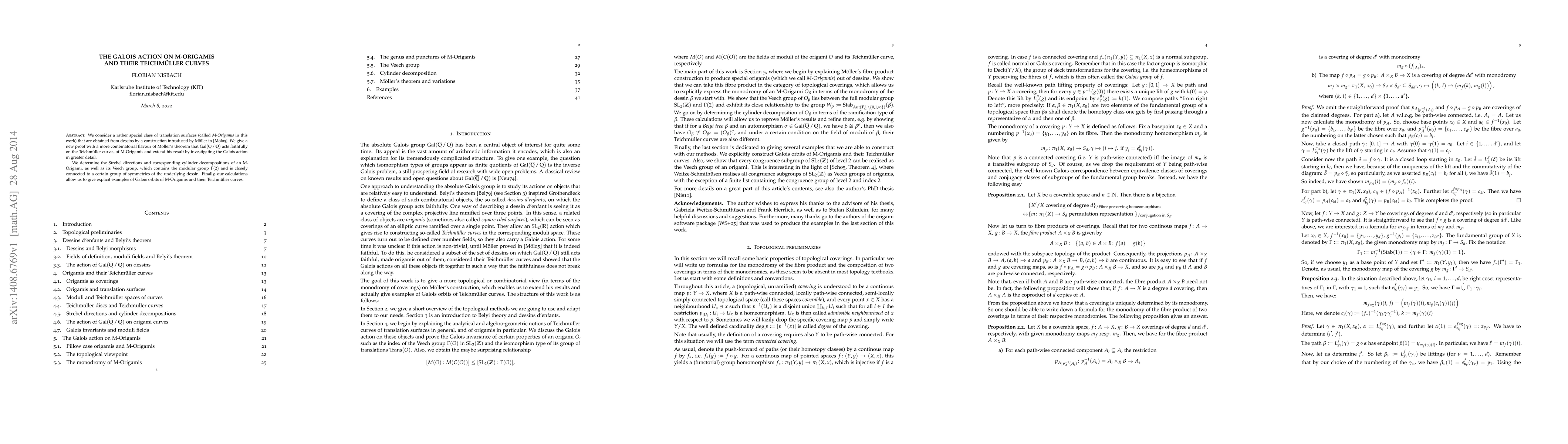 This paper provides a combinatorial proof of Möller's theorem that the Galois group acts faithfully on the Teichmüller curves of M-Origamis, extending the result with detailed investigation into the Galois action. It also determines Strebel directions, cylinder decompositions, and Veech groups of M-Origamis, offering explicit examples of Galois orbits.