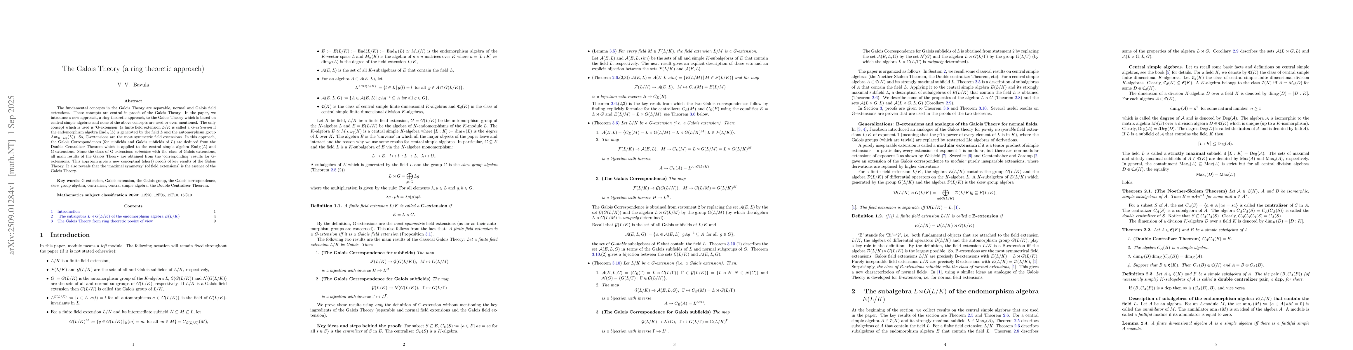 The fundamental concepts in the Galois Theory are separable, normal and Galois field extensions. These concepts are central in proofs of the Galois Theory. In the paper, we introduce a new approach, a ring theoretic approach, to the Galois Theory which is based on central simple algebras and none of the above concepts are used or even mentioned. The only concept which is used is `G-extension' (a finite field extension $L/K$ is called a {\em G-extension} if the endomorphism algebra ${\rm End}_K(L)$ is generated by the field $L$ and the automorphism group ${\rm Aut}_{K-{\rm alg}}(L)$). So, G-extensions are the most symmetric field extensions. In this approach, the Galois Correspondences (for subfields and Galois subfields of $L$) are deduced from the Double Centralizer Theorem which is applied to the central simple algebra ${\rm End}_K(L)$ and G-extensions. Since the class of G-extensions {\em coincides} with the class of Galois extensions, all main results of the Galois Theory are obtained from the `corresponding' results for G-extensions. This approach gives a new conceptual (short) proofs of key results of the Galois Theory. It also reveals that the `maximal symmetry' (of field extensions) is the essence of the Galois Theory.