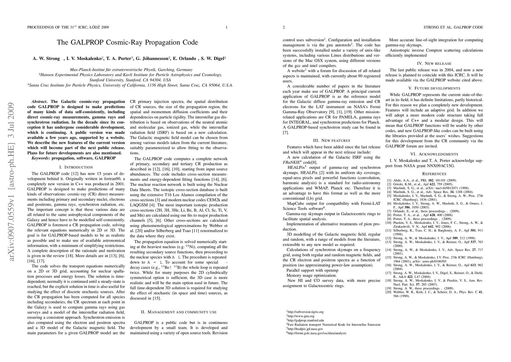 The GALPROP code predicts cosmic-ray data, including direct measurements, gamma rays, and synchrotron radiation, and has seen significant updates; the latest version includes new features set for the next public release. Future development plans are also outlined.
