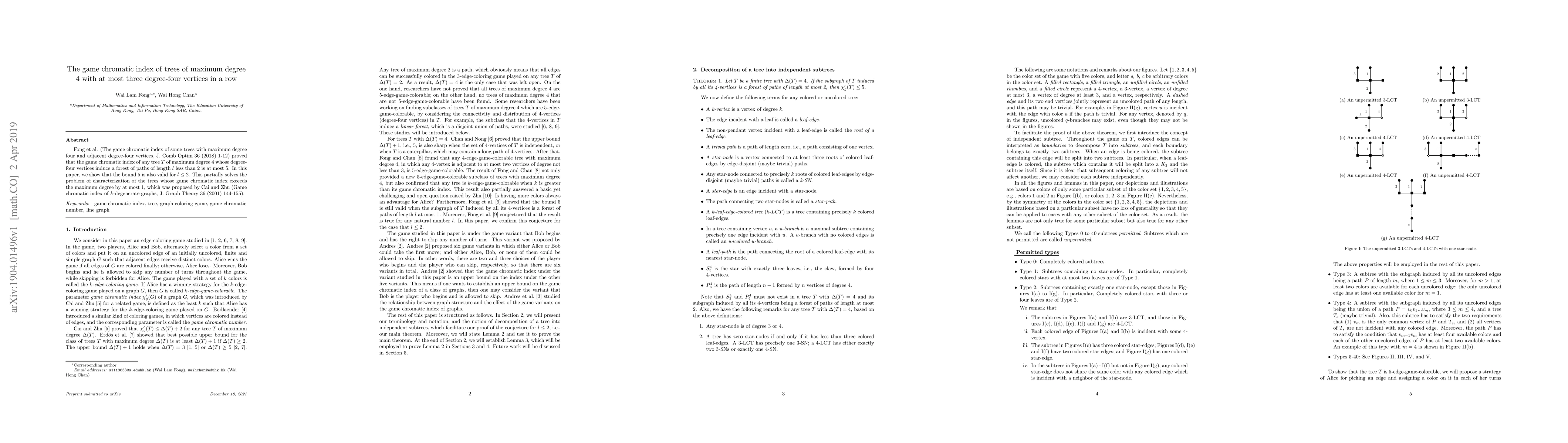 Researchers prove that for trees with a maximum degree of 4, the game chromatic index is at most 5 when there are no more than three consecutive degree-four vertices in a row. This bound partially solves a problem proposed by Cai and Zhu.