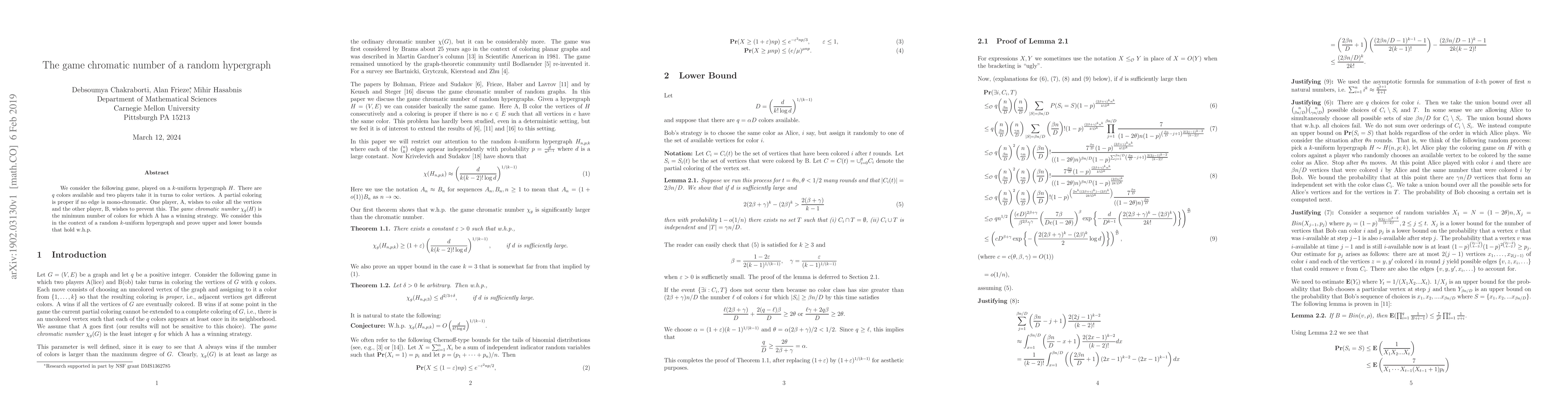 Researchers study a game on random hypergraphs where two players try to color vertices with limited colors, finding upper and lower bounds for the minimum number of colors needed to win, which hold almost surely.