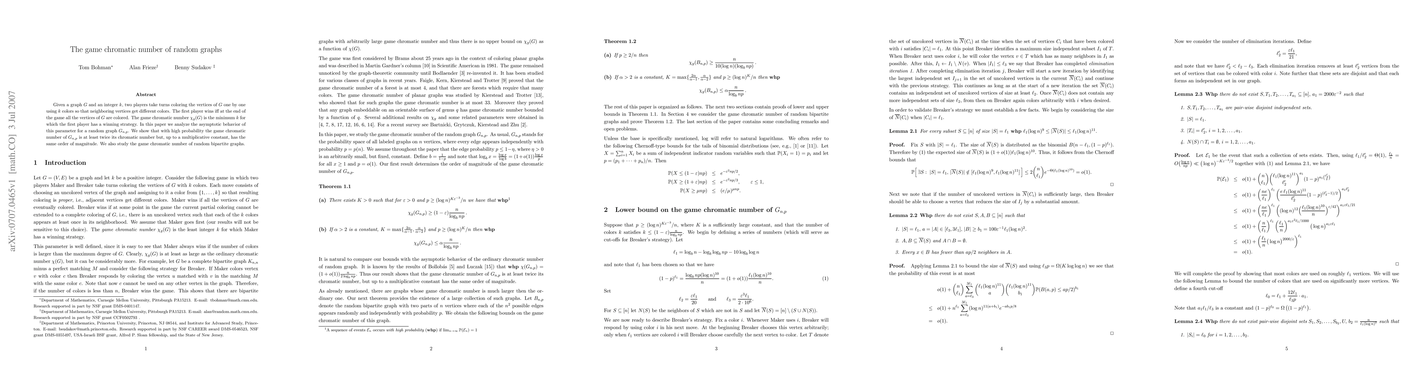 This paper investigates the game chromatic number \chi_g(G) for random graphs G_{n,p}, demonstrating that with high probability it is at least twice the traditional chromatic number but shares the same order of magnitude. It also examines the game chromatic number for random bipartite graphs.