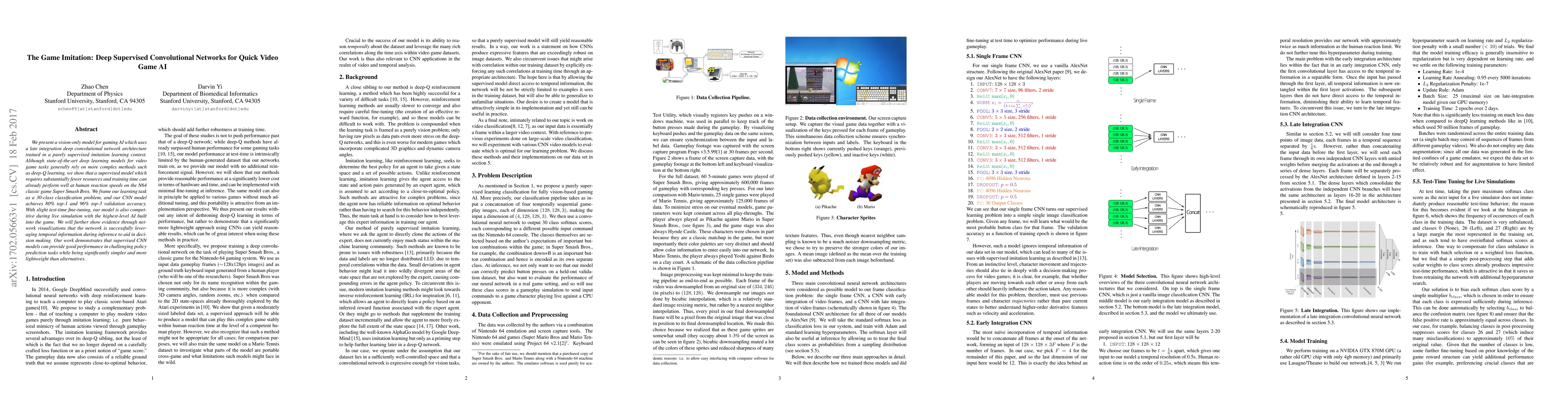 The paper introduces a vision-only, supervised deep convolutional network for video game AI, achieving 80% top-1 and 95% top-3 accuracy on the N64 game Super Smash Bros. This model, simpler and more lightweight than alternatives, demonstrates competitive performance at human reaction speeds, leveraging temporal information for decision-making.