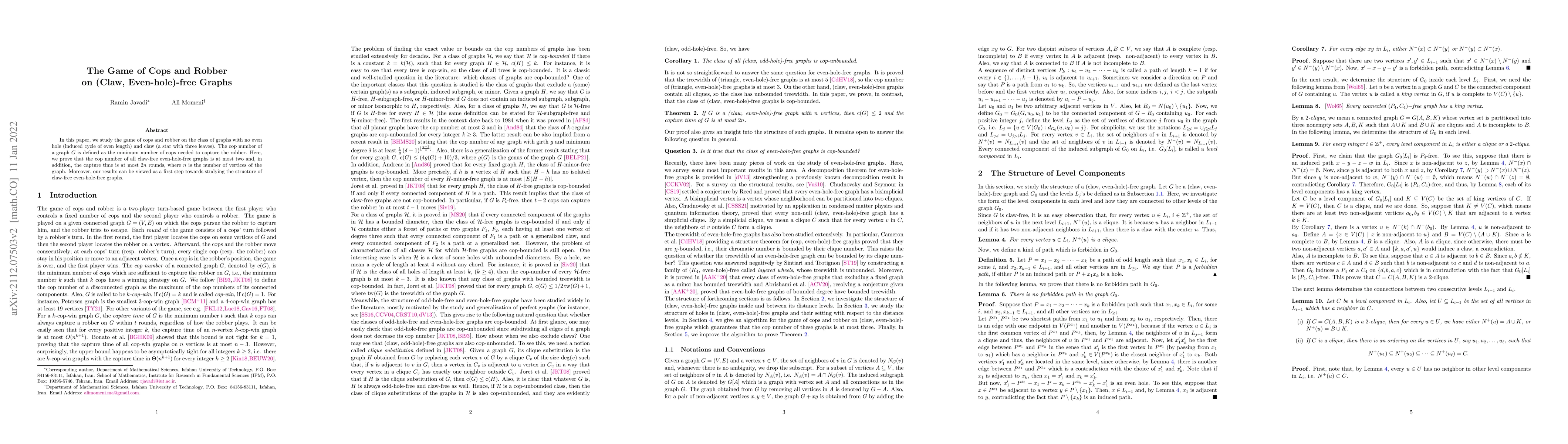 This paper investigates the game of cops and robber on graphs that lack even holes and claws, proving that two cops are sufficient to capture the robber within $2n$ rounds, where $n$ is the number of vertices. This establishes foundational results for understanding the structure of such graphs.