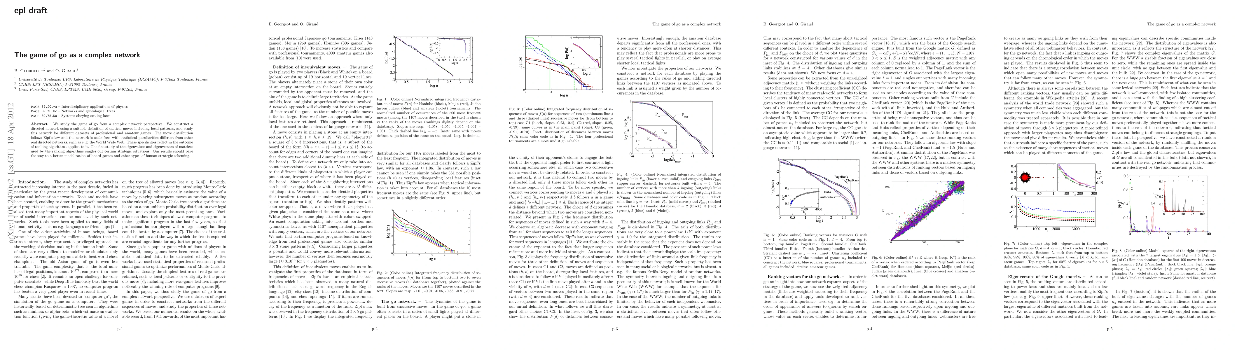 The game of go is analyzed as a complex network, revealing a scale-free structure with Zipf's law governing move distribution, distinct from typical real-world networks. This unique network behavior impacts the effectiveness of ranking algorithms, highlighting strategic nuances in the game.