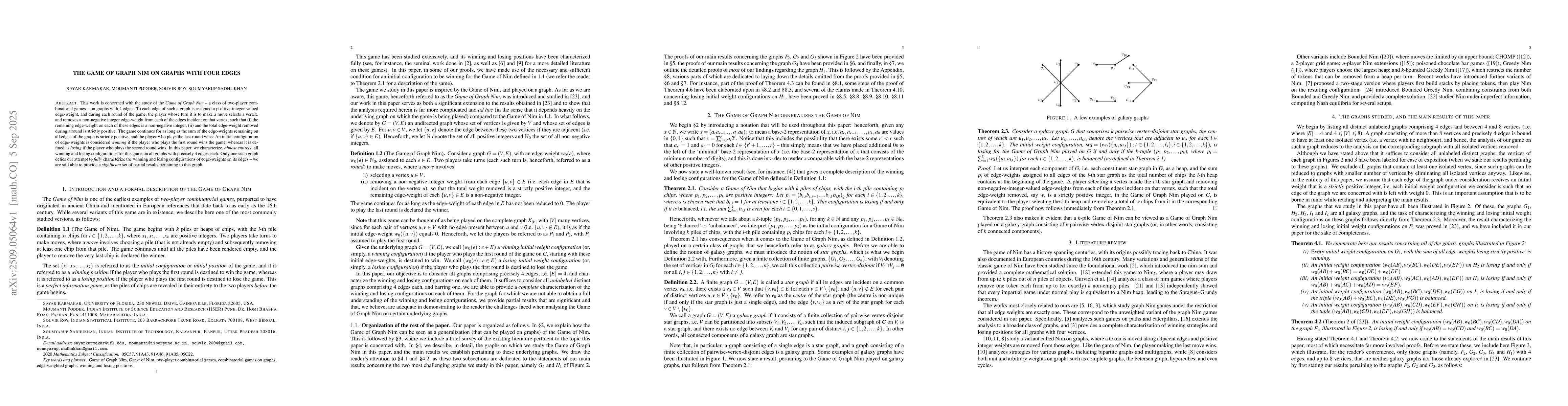 This work is concerned with the study of the Game of Graph Nim -- a class of two-player combinatorial games -- on graphs with $4$ edges. To each edge of such a graph is assigned a positive-integer-valued edge-weight, and during each round of the game, the player whose turn it is to make a move selects a vertex, and removes a non-negative integer edge-weight from each of the edges incident on that vertex, such that the remaining edge-weight on each of these edges is a non-negative integer, and the total edge-weight removed during a round is strictly positive. The game continues for as long as the sum of the edge-weights remaining on all edges of the graph is strictly positive, and the player who plays the last round wins. An initial configuration of edge-weights is considered winning if the player who plays the first round wins the game, whereas it is defined as losing if the player who plays the second round wins. In this paper, we characterize, almost entirely, all winning and losing configurations for this game on all graphs with precisely $4$ edges each. Only one such graph defies our attempt to fully characterize the winning and losing configurations of edge-weights on its edges -- we are still able to provide a significant set of partial results pertaining to this graph.