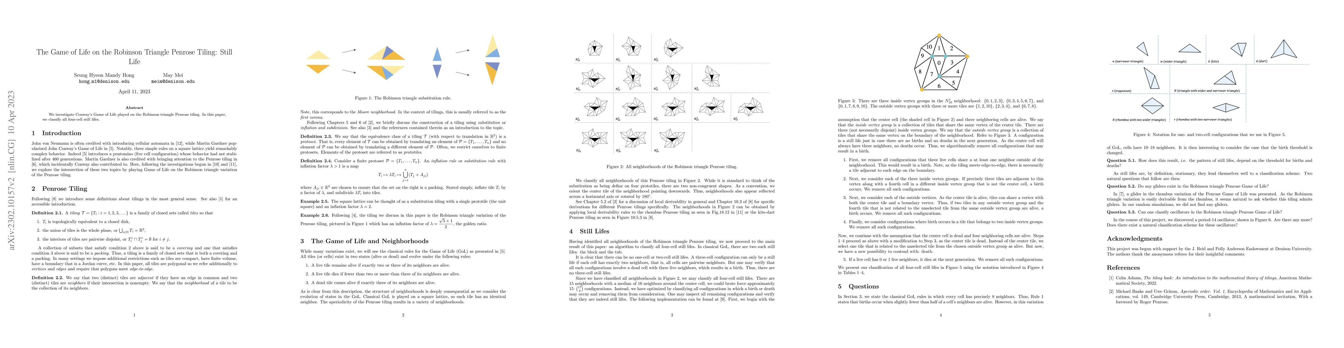 This paper explores Conway's Game of Life on the Robinson triangle Penrose tiling and classifies all four-cell still lifes, contributing to the understanding of cellular automata in non-standard geometries.