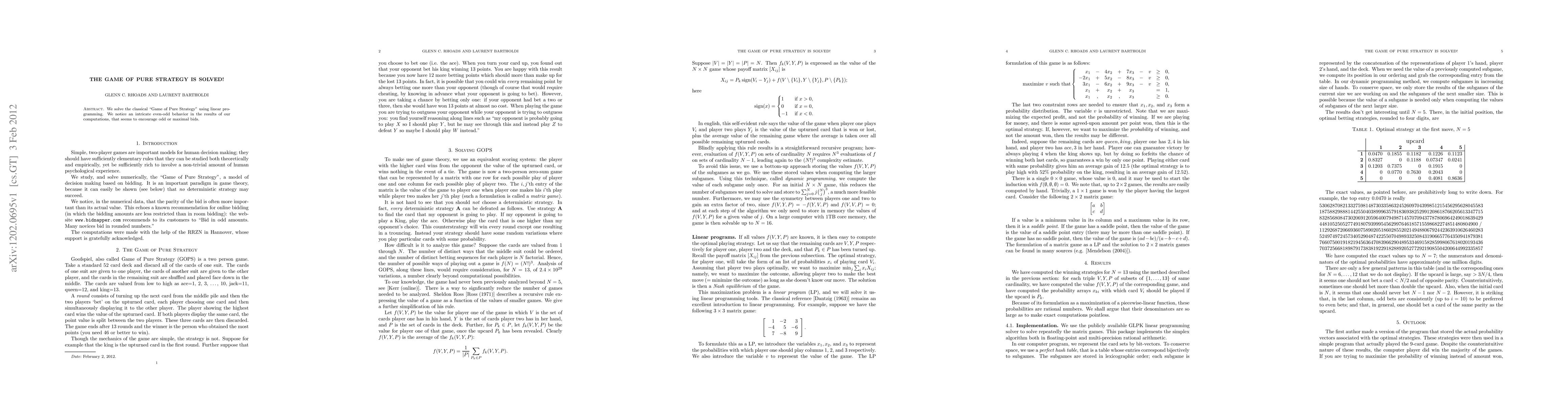 A research paper solves the Game of Pure Strategy using linear programming, finding an intriguing even-odd behavior that encourages maximal bids. The solution has implications for strategic decision-making in various fields.