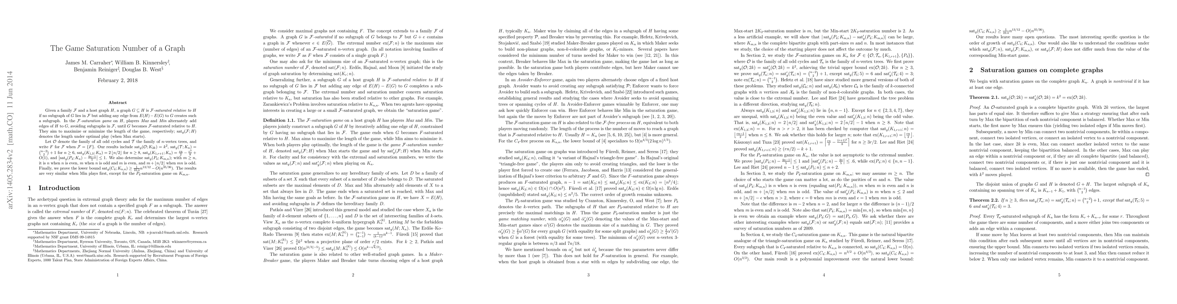 The paper presents detailed strategies and proofs for determining the saturation numbers of various graph families under different initial player conditions, advancing the theoretical understanding of graph saturation games