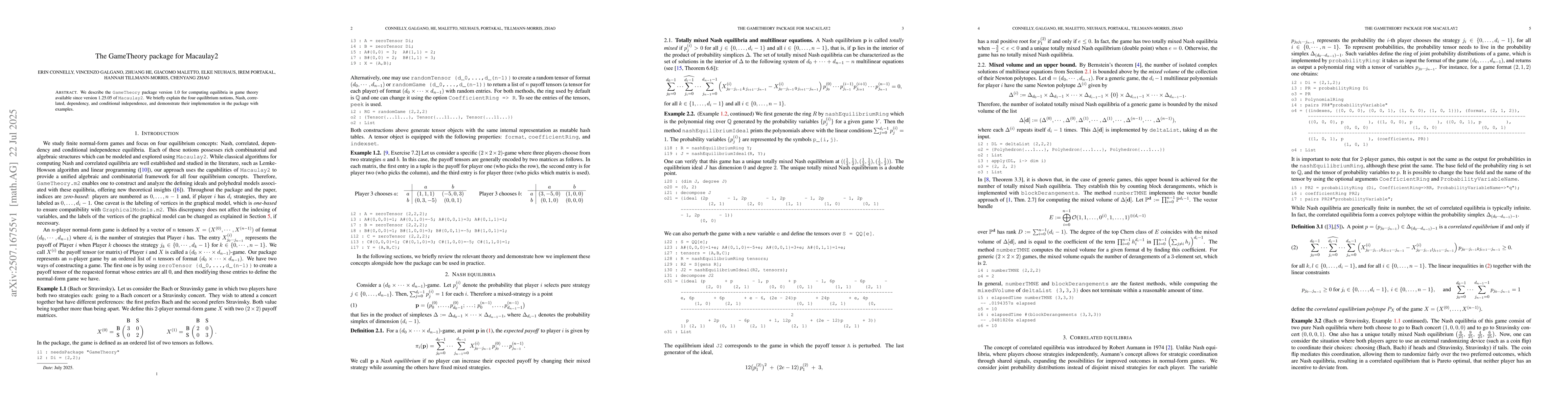 We describe the GameTheory package version 1.0 for computing equilibria in game theory available since version 1.25.05 of Macaulay2. We briefly explain the four equilibrium notions, Nash, correlated, dependency, and conditional independence, and demonstrate their implementation in the package with examples.