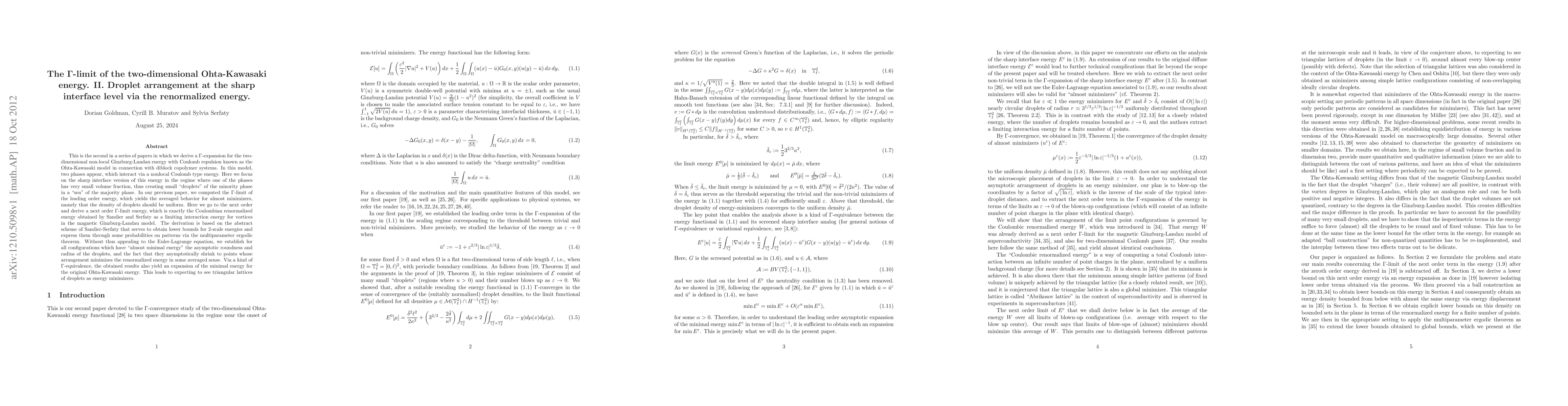 This is the second in a series of papers in which we derive a $\Gamma$-expansion for the two-dimensional non-local Ginzburg-Landau energy with Coulomb repulsion known as the Ohta-Kawasaki model in connection with diblock copolymer systems. In this model, two phases appear, which interact via a nonlocal Coulomb type energy. Here we focus on the sharp interface version of this energy in the regime where one of the phases has very small volume fraction, thus creating small "droplets" of the minority phase in a "sea" of the majority phase. In our previous paper, we computed the $\Gamma$-limit of the leading order energy, which yields the averaged behavior for almost minimizers, namely that the density of droplets should be uniform. Here we go to the next order and derive a next order $\Gamma$-limit energy, which is exactly the Coulombian renormalized energy obtained by Sandier and Serfaty as a limiting interaction energy for vortices in the magnetic Ginzburg-Landau model. The derivation is based on the abstract scheme of Sandier-Serfaty that serves to obtain lower bounds for 2-scale energies and express them through some probabilities on patterns via the multiparameter ergodic theorem. Without thus appealing to the Euler-Lagrange equation, we establish for all configurations which have "almost minimal energy" the asymptotic roundness and radius of the droplets, and the fact that they asymptotically shrink to points whose arrangement minimizes the renormalized energy in some averaged sense. Via a kind of $\Gamma$-equivalence, the obtained results also yield an expansion of the minimal energy for the original Ohta-Kawasaki energy. This leads to expecting to see triangular lattices of droplets as energy minimizers.