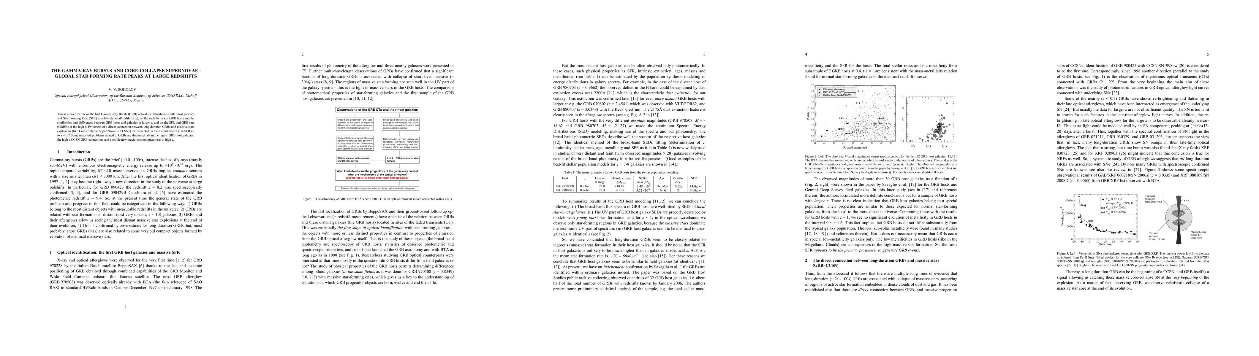 This paper reviews the identification of gamma-ray bursts (GRBs) and their host galaxies, highlighting the correlation between long-duration GRBs and massive star explosions like core-collapse supernovae. It discusses the global star-forming rate peak at high redshifts and unresolved issues regarding high-z GRB hosts and the CCSN-GRB connection.