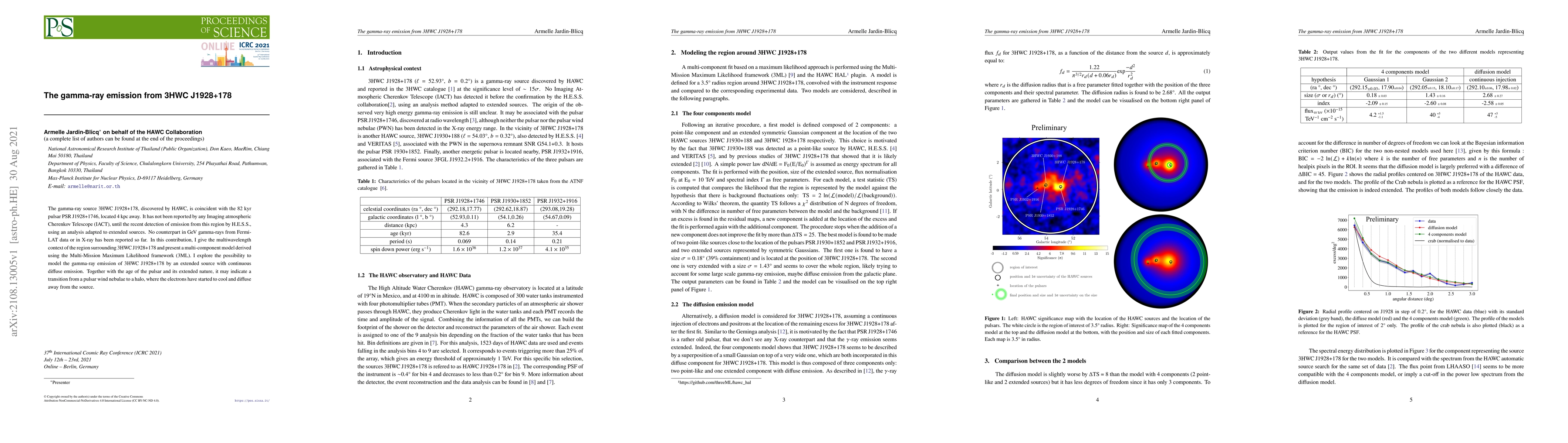 The gamma-ray source 3HWC J1928+178, discovered by HAWC, is coincident with the 82 kyr pulsar PSR J1928+1746, located 4 kpc away. It has not been reported by any Imaging atmospheric Cherenkov Telescope (IACT), until the recent detection of emission from this region by H.E.S.S., using an analysis adapted to extended sources. No counterpart in GeV gamma-rays from Fermi-LAT data or in X-ray has been reported so far. In this contribution, I give the multiwavelength context of the region surrounding 3HWC J1928+178 and present a multi-component model derived using the Multi-Mission Maximum Likelihood framework (3ML). I explore the possibility to model the gamma-ray emission of 3HWC J1928+178 by an extended source with continuous diffuse emission. Together with the age of the pulsar and its extended nature, it may indicate a transition from a pulsar wind nebulae to a halo, where the electrons have started to cool and diffuse away from the source.