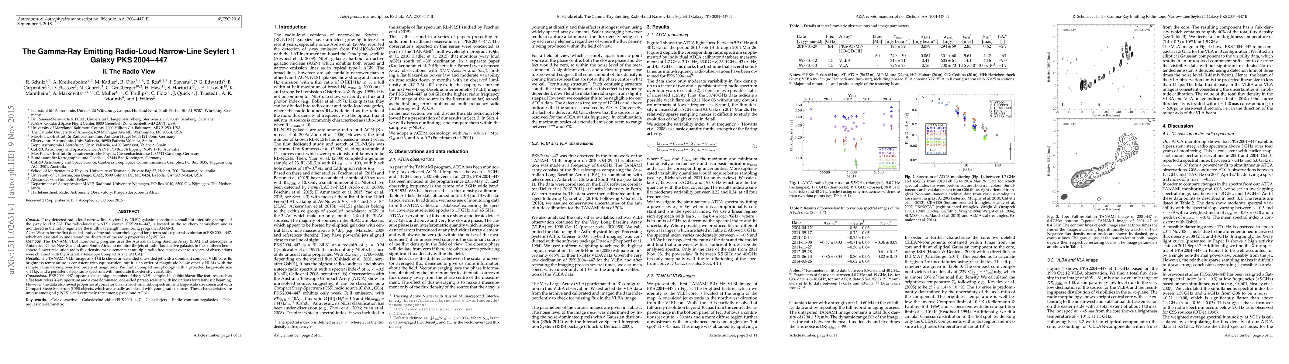 Gamma-ray detected radio-loud narrow-line Seyfert 1 (g-NLS1) galaxies constitute a small but interesting sample of the gamma-ray loud AGN. The radio-loudest g-NLS1 known, PKS 2004-447, is located in the southern hemisphere and is monitored in the radio regime by the multiwavelength monitoring program TANAMI. We aim for the first detailed study of the radio morphology and long-term radio spectral evolution of PKS 2004-447, which are essential to understand the diversity of the radio properties of g-NLS1s. The TANAMI VLBI monitoring program uses the Australian Long Baseline Array (LBA) and telescopes in Antarctica, Chile, New Zealand, and South Africa to monitor the jets of radio-loud active galaxies in the southern hemisphere. Lower resolution radio flux density measurements at multiple radio frequencies over four years of observations were obtained with the Australia Telescope Compact Array (ATCA). The TANAMI VLBI image at 8.4 GHz shows an extended one-sided jet with a dominant compact VLBI core. Its brightness temperature is consistent with equipartition, but it is an order of magnitude below other g-NLS1s with the sample value varying over two orders of magnitude. We find a compact morphology with a projected large-scale size <11 kpc and a persistent steep radio spectrum with moderate flux-density variability. PKS 2004-447 appears to be a unique member of the g-NLS1 sample. It exhibits blazar-like features, such as a flat featureless X-ray spectrum and a core dominated, one-sided parsec-scale jet with indications for relativistic beaming. However, the data also reveal properties atypical for blazars, such as a radio spectrum and large-scale size consistent with Compact-Steep-Spectrum (CSS) objects, which are usually associated with young radio sources. These characteristics are unique among all g-NLS1s and extremely rare among gamma-ray loud AGN.
