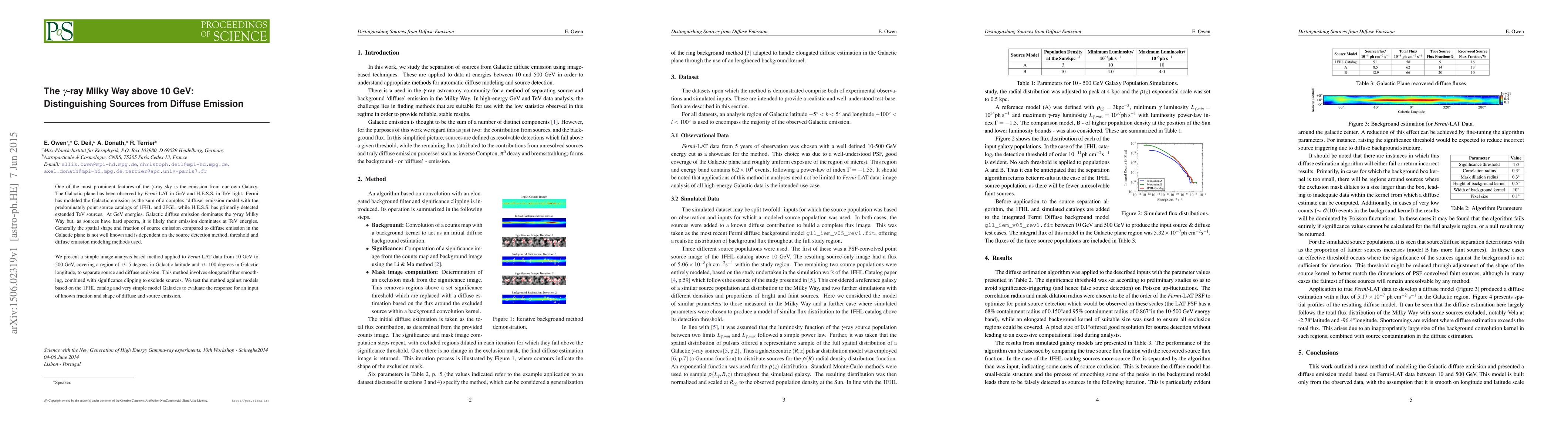 One of the most prominent features of the $\gamma$-ray sky is the emission from our own Galaxy. The Galactic plane has been observed by Fermi-LAT in GeV and H.E.S.S. in TeV light. Fermi has modeled the Galactic emission as the sum of a complex 'diffuse' emission model with the predominately point source catalogs of 1FHL and 2FGL, while H.E.S.S. has primarily detected extended TeV sources. At GeV energies, Galactic diffuse emission dominates the $\gamma$-ray Milky Way but, as sources have hard spectra, it is likely their emission dominates at TeV energies. Generally the spatial shape and fraction of source emission compared to diffuse emission in the Galactic plane is not well known and is dependent on the source detection method, threshold and diffuse emission modeling methods used. We present a simple image-analysis based method applied to Fermi-LAT data from 10 GeV to 500 GeV, covering a region of +/- 5 degrees in Galactic latitude and +/- 100 degrees in Galactic longitude, to separate source and diffuse emission. This method involves elongated filter smoothing, combined with significance clipping to exclude sources. We test the method against models based on the 1FHL catalog and very simple model Galaxies to evaluate the response for an input of known fraction and shape of diffuse and source emission.