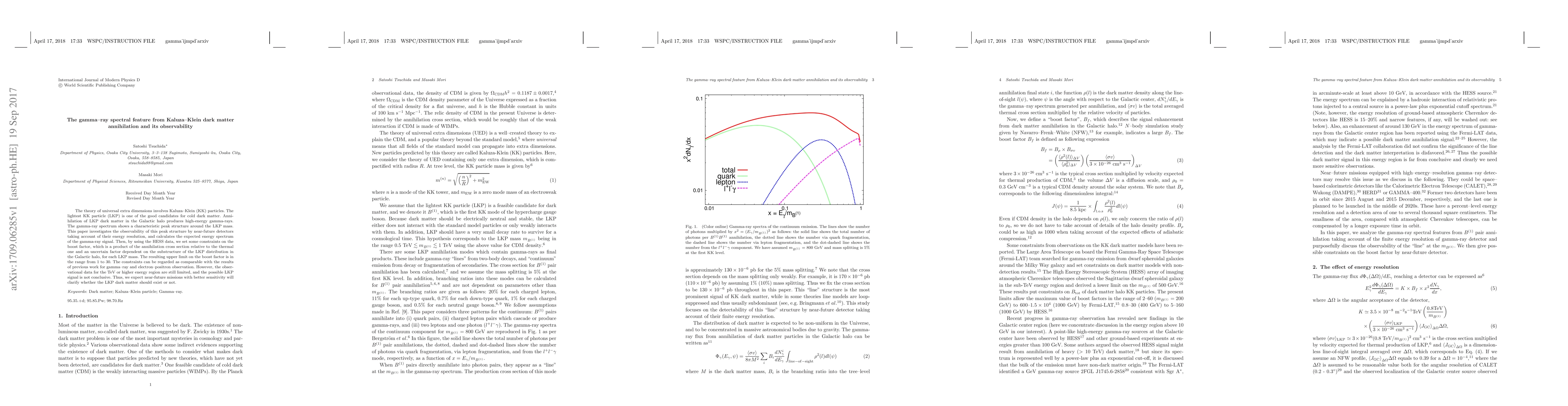 This paper explores the gamma-ray spectral feature from the annihilation of Kaluza-Klein dark matter in the Galactic halo, focusing on the observability of a characteristic peak structure. It sets constraints on the boost factor using HESS data, finding limits ranging from 1 to 30, but notes that better-sensitive future missions are needed to conclusively detect this signal.
