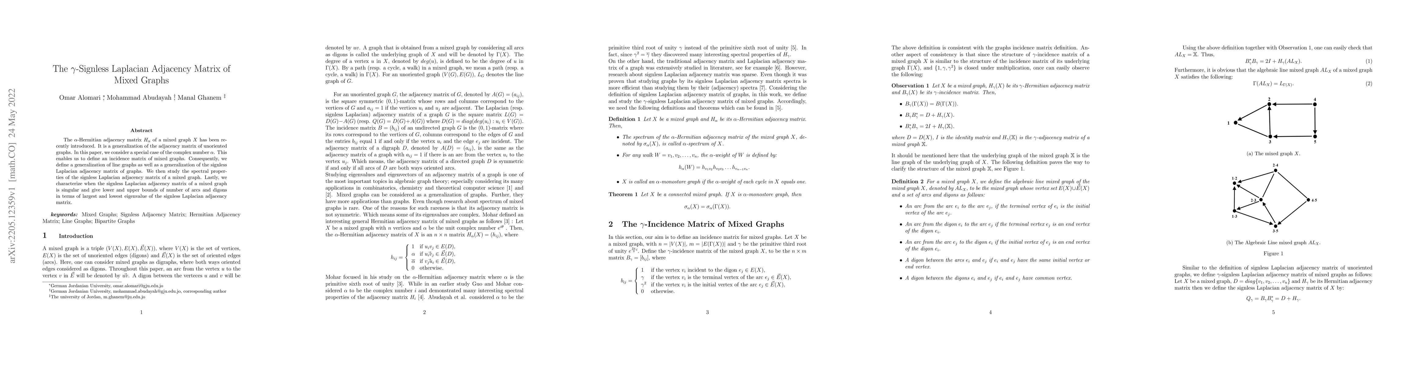 The paper defines and analyzes the $\gamma$-signless Laplacian adjacency matrix of mixed graphs, providing spectral bounds and characterizing its singularity.