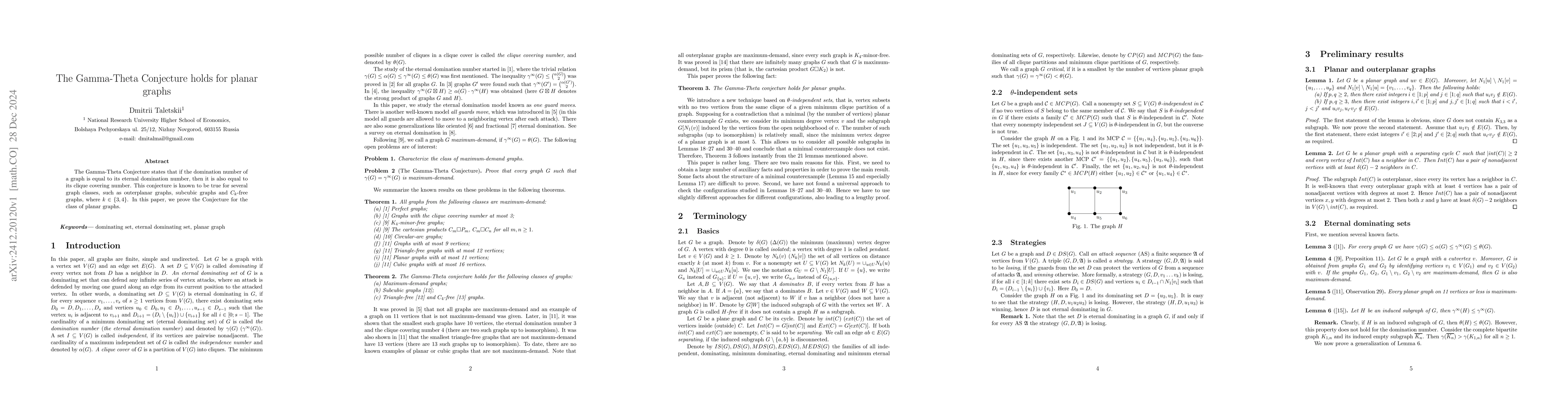 This paper confirms the Gamma-Theta Conjecture for planar graphs, demonstrating that if the domination number equals the eternal domination number, it also equals the clique covering number in these graphs. The conjecture was previously verified for several other graph classes.