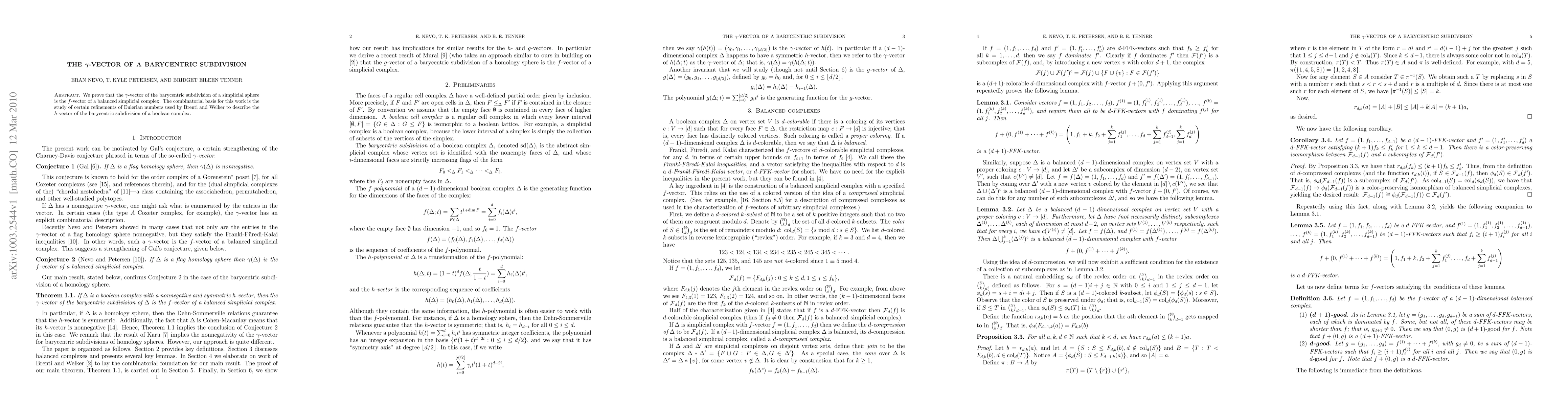 We prove that the $\gamma$-vector of the barycentric subdivision of a simplicial sphere is the $f$-vector of a balanced simplicial complex. The combinatorial basis for this work is the study of certain refinements of Eulerian numbers used by Brenti and Welker to describe the $h$-vector of the barycentric subdivision of a boolean complex.