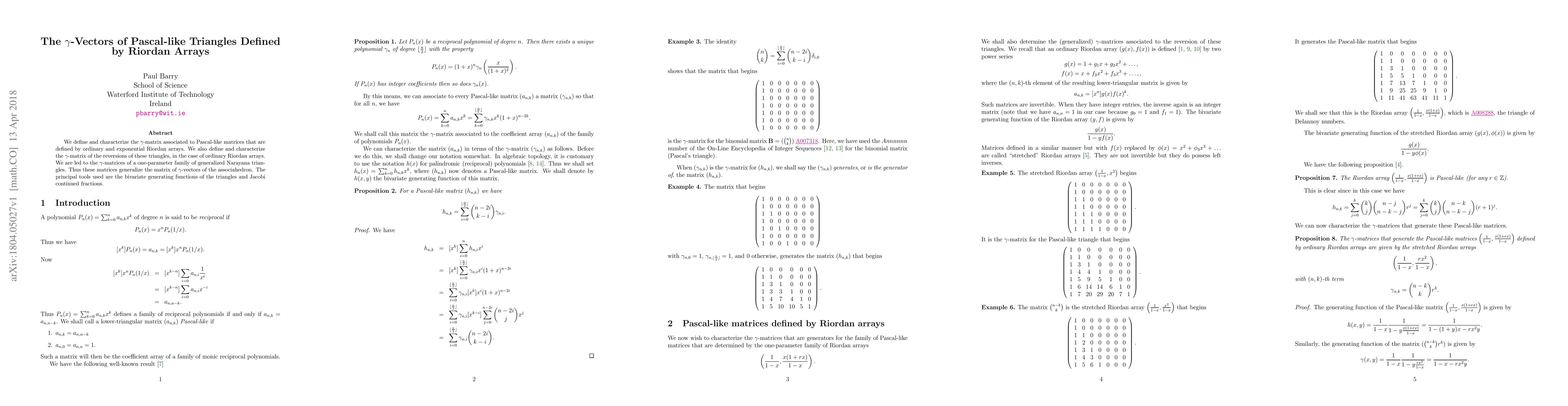We define and characterize the $\gamma$-matrix associated to Pascal-like matrices that are defined by ordinary and exponential Riordan arrays. We also define and characterize the $\gamma$-matrix of the reversions of these triangles, in the case of ordinary Riordan arrays. We are led to the $\gamma$-matrices of a one-parameter family of generalized Narayana triangles. Thus these matrices generalize the matrix of $\gamma$-vectors of the associahedron. The principal tools used are the bivariate generating functions of the triangles and Jacobi continued fractions.