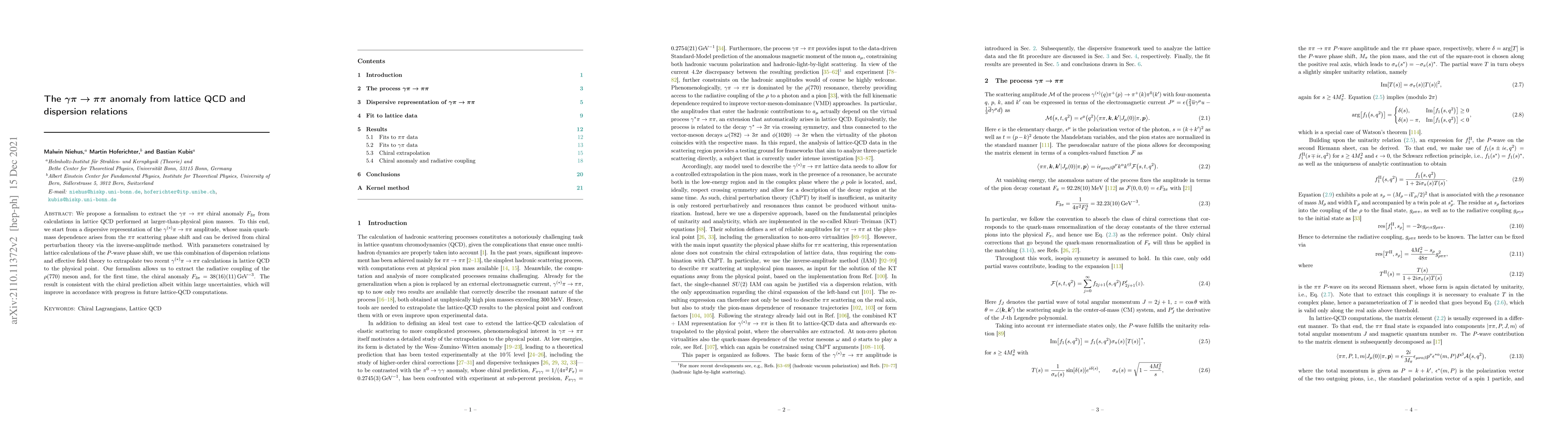 This paper proposes a method to extract the $\gamma\pi\to\pi\pi$ chiral anomaly $F_{3\pi}$ from lattice QCD calculations using dispersion relations and effective field theory. The result, $F_{3\pi}=38(16)(11)\,\text{GeV}^{-3}$, is consistent with chiral predictions but has large uncertainties that are expected to improve with future lattice QCD advancements.