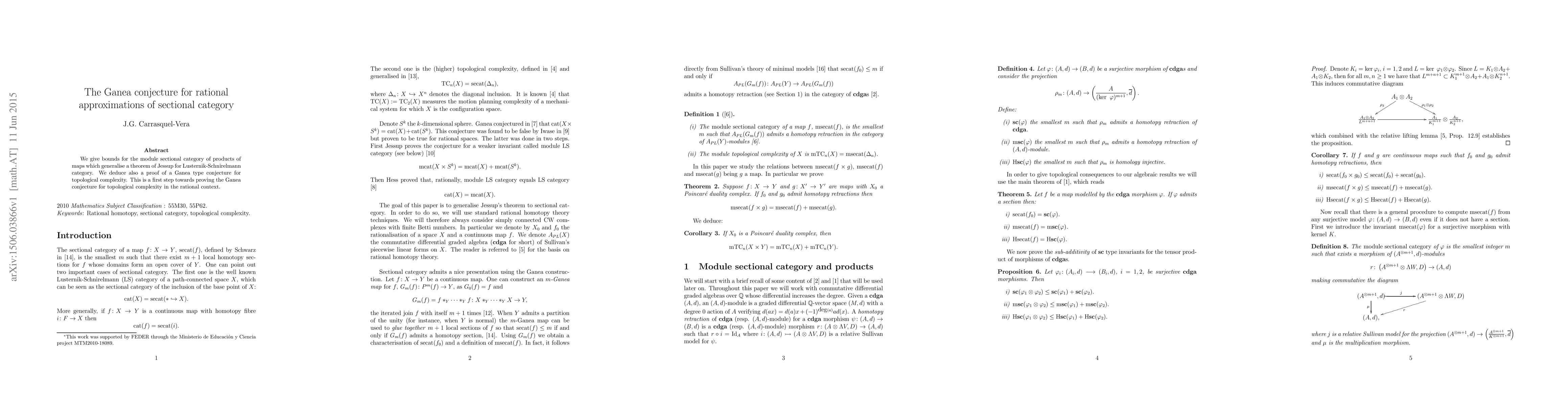 The paper provides bounds for the module sectional category of products of maps, extending a theorem related to Lusternik-Schnirelmann category. It also proves a Ganea type conjecture for topological complexity, marking an initial step towards verifying the Ganea conjecture in the rational context.