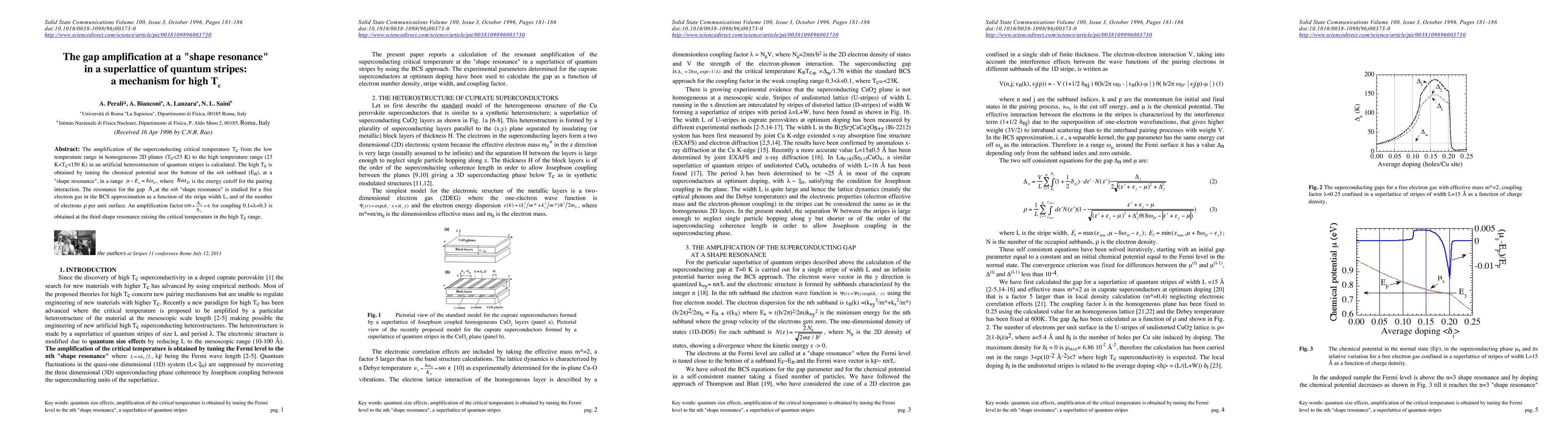 This paper investigates the mechanism behind the amplification of superconducting critical temperature Tc in a superlattice of quantum stripes, achieving high Tc from 23 K to 150 K by tuning the chemical potential near a "shape resonance." The resonance effect is analyzed for a free electron gas in the BCS approximation, resulting in an amplification factor of 0.1 to 0.3 at the third shape resonance.