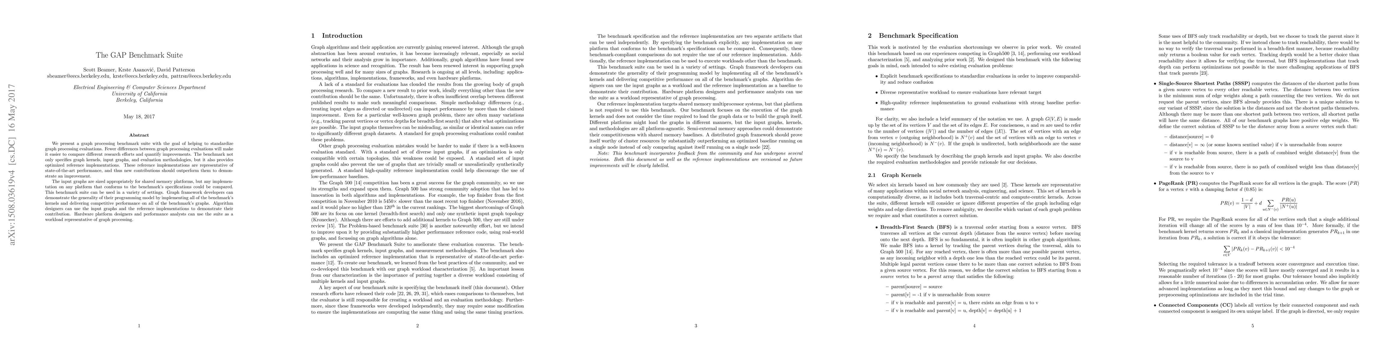 The paper presents a graph processing benchmark suite, GAP, aiming to standardize graph processing evaluations. It specifies graph kernels, input graphs, and evaluation methodologies, providing optimized baseline implementations reflective of state-of-the-art performance.