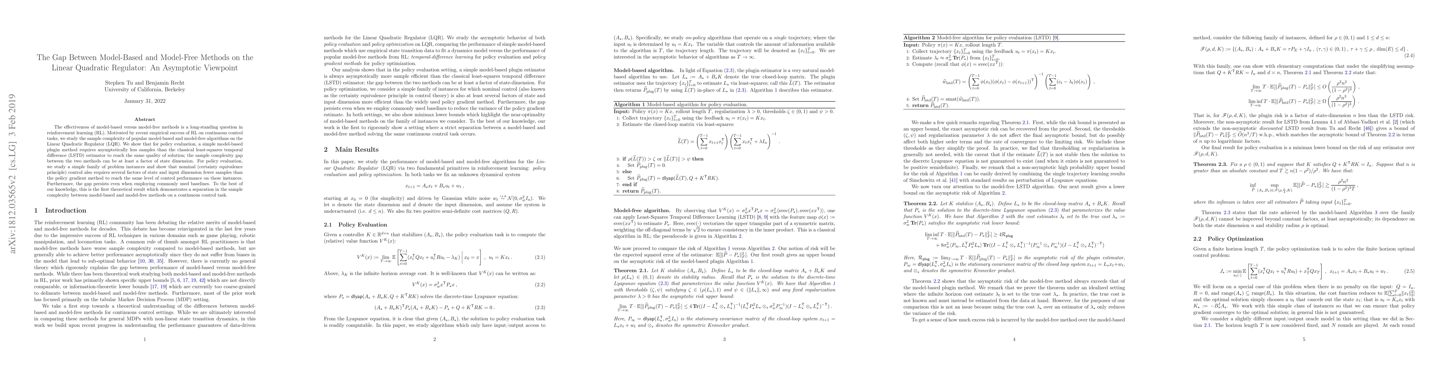 This paper compares model-based and model-free reinforcement learning methods for the Linear Quadratic Regulator, finding that model-based methods require significantly fewer samples to achieve similar performance, with the gap scaling with the state dimension. The study highlights the theoretical advantages of model-based approaches over model-free methods in terms of sample complexity.