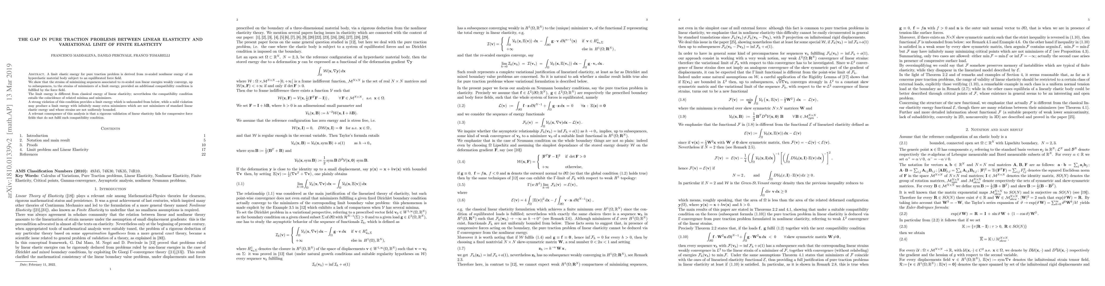 The paper presents a detailed mathematical analysis showing the existence and properties of a limit energy for pure traction problems in finite elasticity, contrasting it with classical linear elasticity, and identifying conditions for their equivalence.