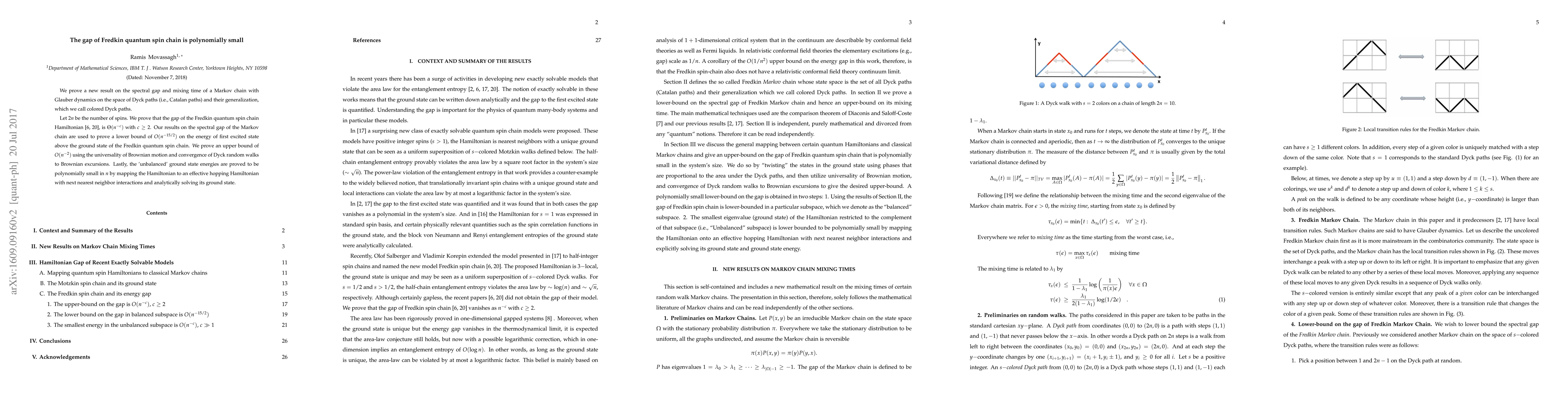 We prove a new result on the spectral gap and mixing time of a Markov chain with Glauber dynamics on the space of Dyck paths (i.e., Catalan paths) and their generalization, which we call colored Dyck paths. The proof uses the comparison theorem of Diaconis and Saloff-Coste and our previous results. Let $2n$ be the number of spins. We prove that the gap of the Fredkin quantum spin chain Hamiltonian [6, 20], is $\Theta(n^{-c})$ with $c\ge2$. Our results on the spectral gap of the Markov chain are used to prove a lower bound of $O(n^{-15/2})$ on the energy of first excited state above the ground state of the Fredkin quantum spin chain. We prove an upper bound of $O(n^{-2})$ using the universality of Brownian motion and convergence of Dyck random walks to Brownian excursions. Lastly, the 'unbalanced' ground state energies are proved to be polynomially small in $n$ by mapping the Hamiltonian to an effective hopping Hamiltonian with next nearest neighbor interactions and analytically solving its ground state.