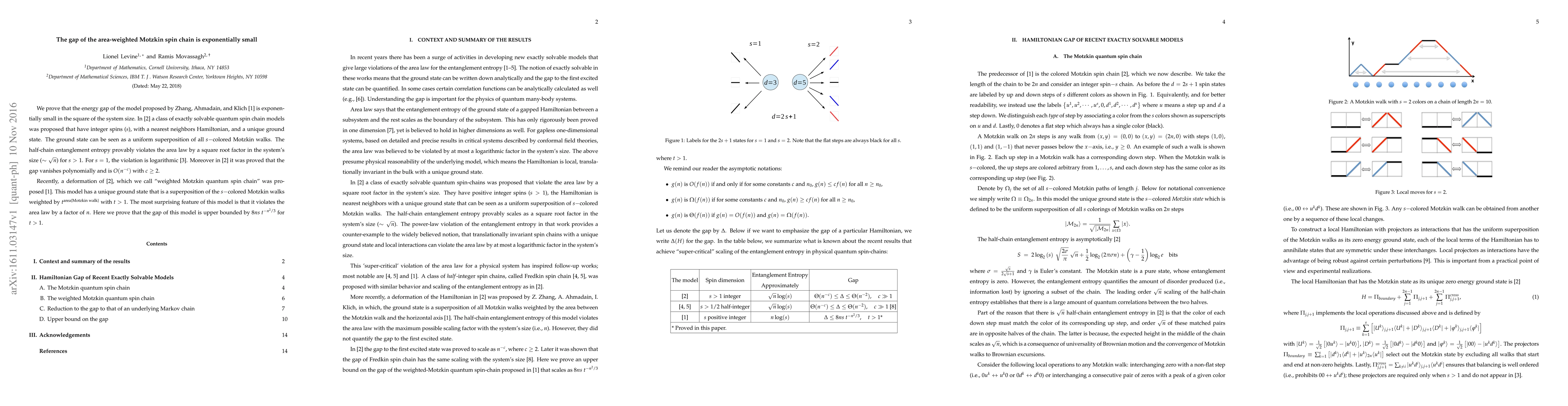 We prove that the energy gap of the model proposed by Zhang, Ahmadain, and Klich [1] is exponentially small in the square of the system size. In [2] a class of exactly solvable quantum spin chain models was proposed that have integer spins ($s$), with a nearest neighbors Hamiltonian, and a unique ground state. The ground state can be seen as a uniform superposition of all $s-$colored Motzkin walks. The half-chain entanglement entropy provably violates the area law by a square root factor in the system's size ($\sim\sqrt{n}$) for $s>1$. For $s=1$, the violation is logarithmic [3]. Moreover in [2] it was proved that the gap vanishes polynomially and is $O(n^{-c})$ with $c\ge2$. Recently, a deformation of [2], which we call "weighted Motzkin quantum spin chain" was proposed [1]. This model has a unique ground state that is a superposition of the $s-$colored Motzkin walks weighted by $t^{\text{area\{Motzkin walk\}}}$ with $t>1$. The most surprising feature of this model is that it violates the area law by a factor of $n$. Here we prove that the gap of this model is upper bounded by $8ns\text{ }t^{-n^{2}/3}$ for $t>1$.
