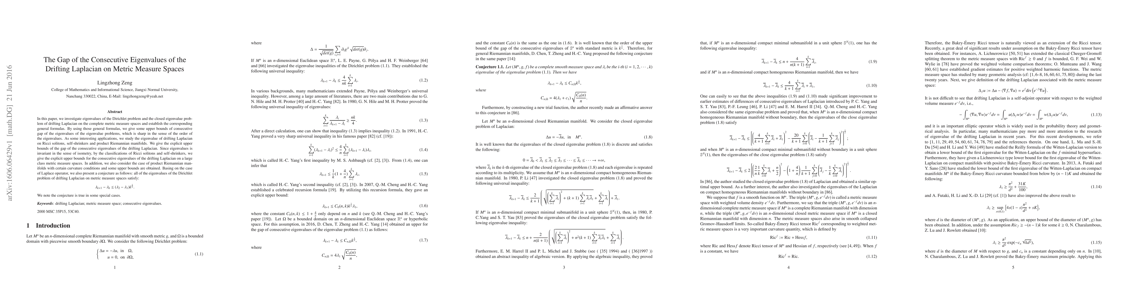 In this paper, we investigate eigenvalues of the Dirichlet problem and the closed eigenvalue problem of drifting Laplacian on the complete metric measure spaces and establish the corresponding general formulas. By using those general formulas, we give some upper bounds of consecutive gap of the eigenvalues of the eigenvalue problems, which is sharp in the sense of the order of the eigenvalues. As some interesting applications, we study the eigenvalue of drifting Laplacian on Ricci solitons, self-shrinkers and product Riemannian manifolds. We give the explicit upper bounds of the gap of the consecutive eigenvalues of the drifting Laplacian. Since eigenvalues is invariant in the sense of isometry, by the classifications of Ricci solitons and self-shrinkers, we give the explicit upper bounds for the consecutive eigenvalues of the drifting Laplacian on a large class metric measure spaces. In addition, we also consider the case of product Riemannian manifolds with certain curvature conditions and some upper bounds are obtained. Basing on the case of Laplace operator, we also present a conjecture as follows: all of the eigenvalues of the Dirichlet problem of drifting Laplacian on metric measure spaces satisfy: $$\lambda_{k+1}-\lambda_{k}\leq(\lambda_{2}-\lambda_{1})k^{\frac{1}{n}}.$$We note the conjecture is true in some special cases.